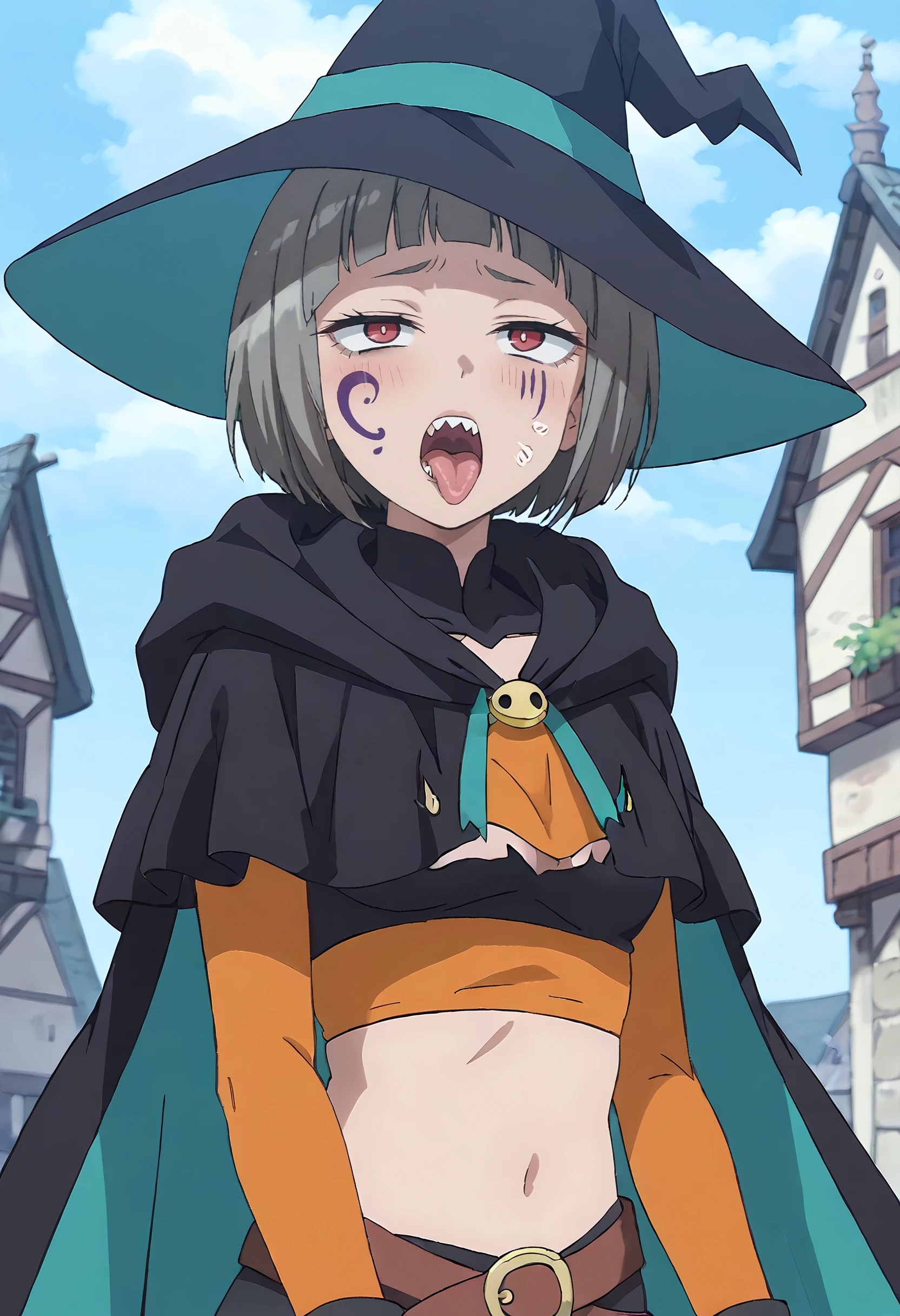 GuriligulaOutfit, cape, cloak, hat, witch hat, black cloak, midriff, witch, crop top, hood, hood down, black hat, gloves, black cape, robe, multicolored cape, black capelet, belt, fingerless gloves, black robe, two-sided fabric, two-sided cape, multicolored clothes, black headwear, long sleeves,