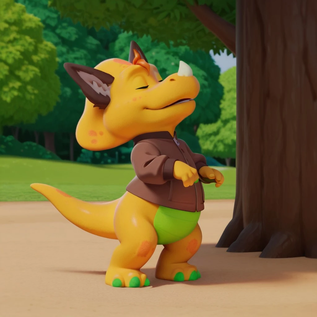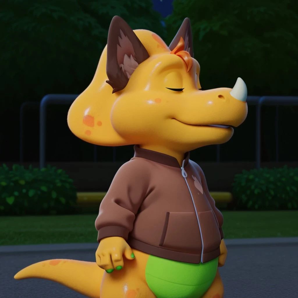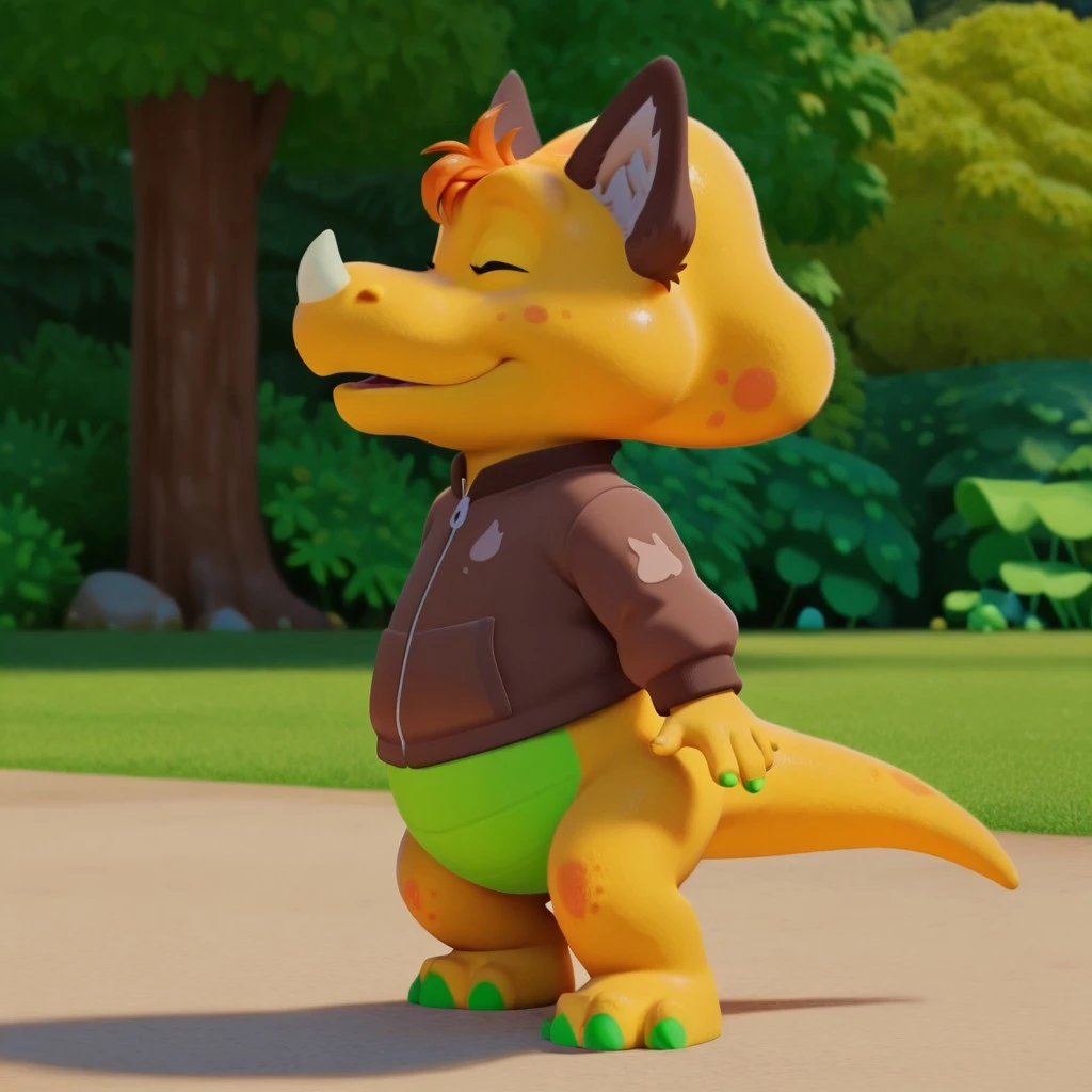 billybwil, semi-anthro, male, dinosaur, yellow skin, orange hair tuft, brown eyes, nose horn
