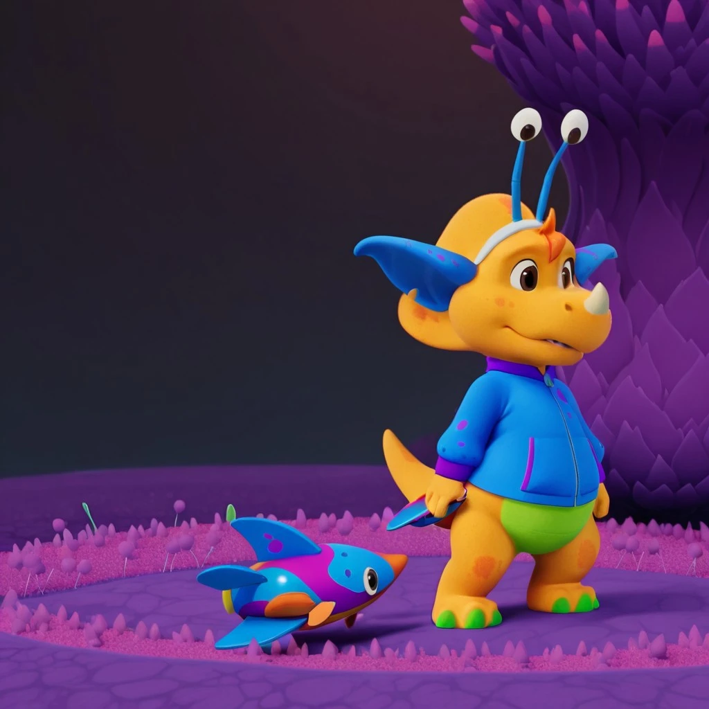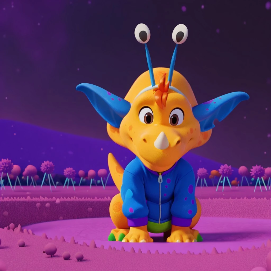 blue pointed ears, antennae eyes, blue jacket purple splotches,