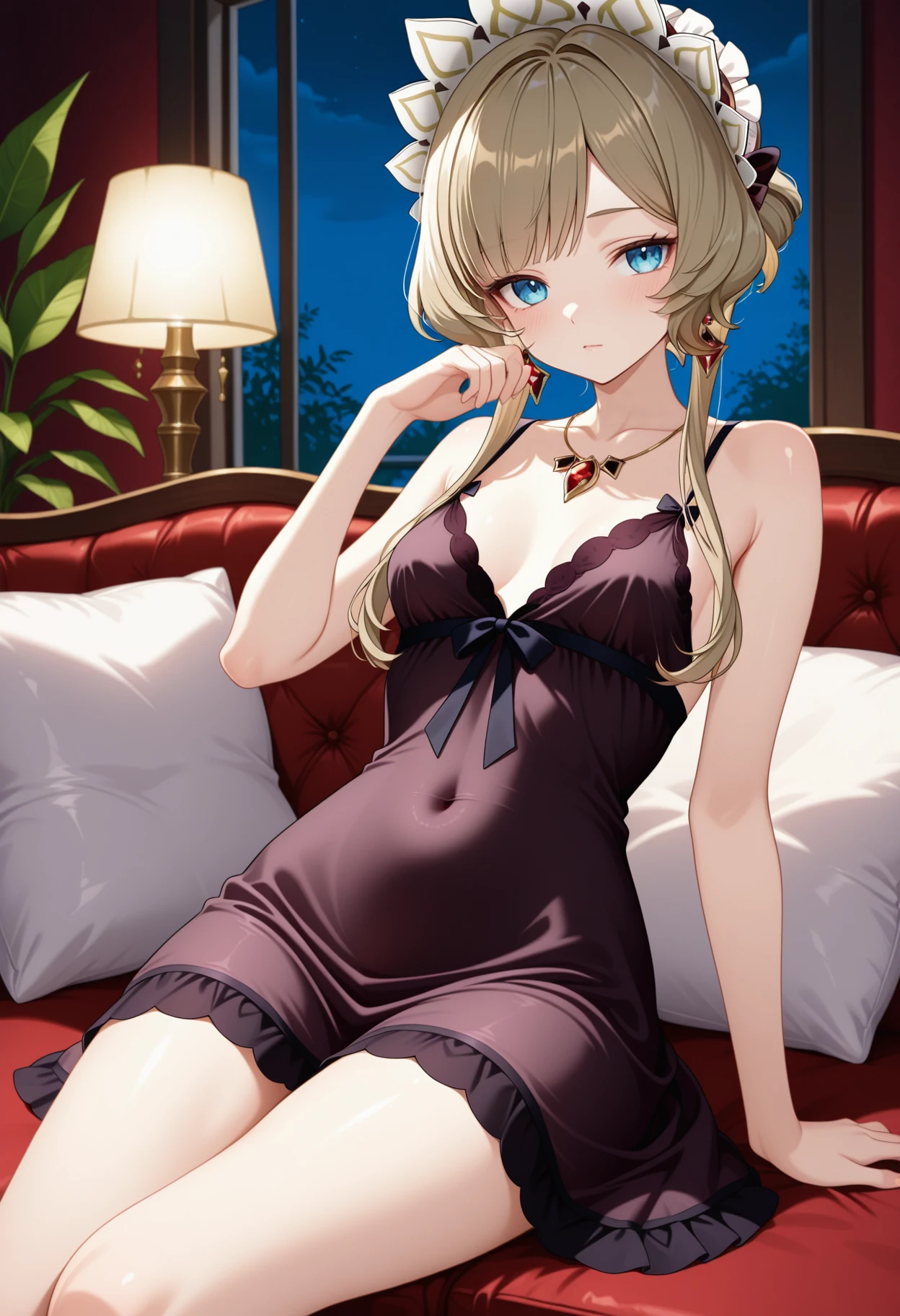 Sandrone, 1girl, solo, breasts, jewelry, sitting, covered navel, looking at viewer, indoors, maid headdress, earrings, blonde hair, necklace, couch, pillow, lamp, thighs, night, closed mouth, blush, nightgown, medium breasts, bare shoulders, plant, window, small breasts, bare arms, hand up