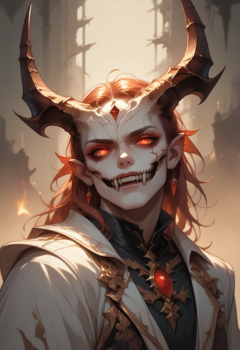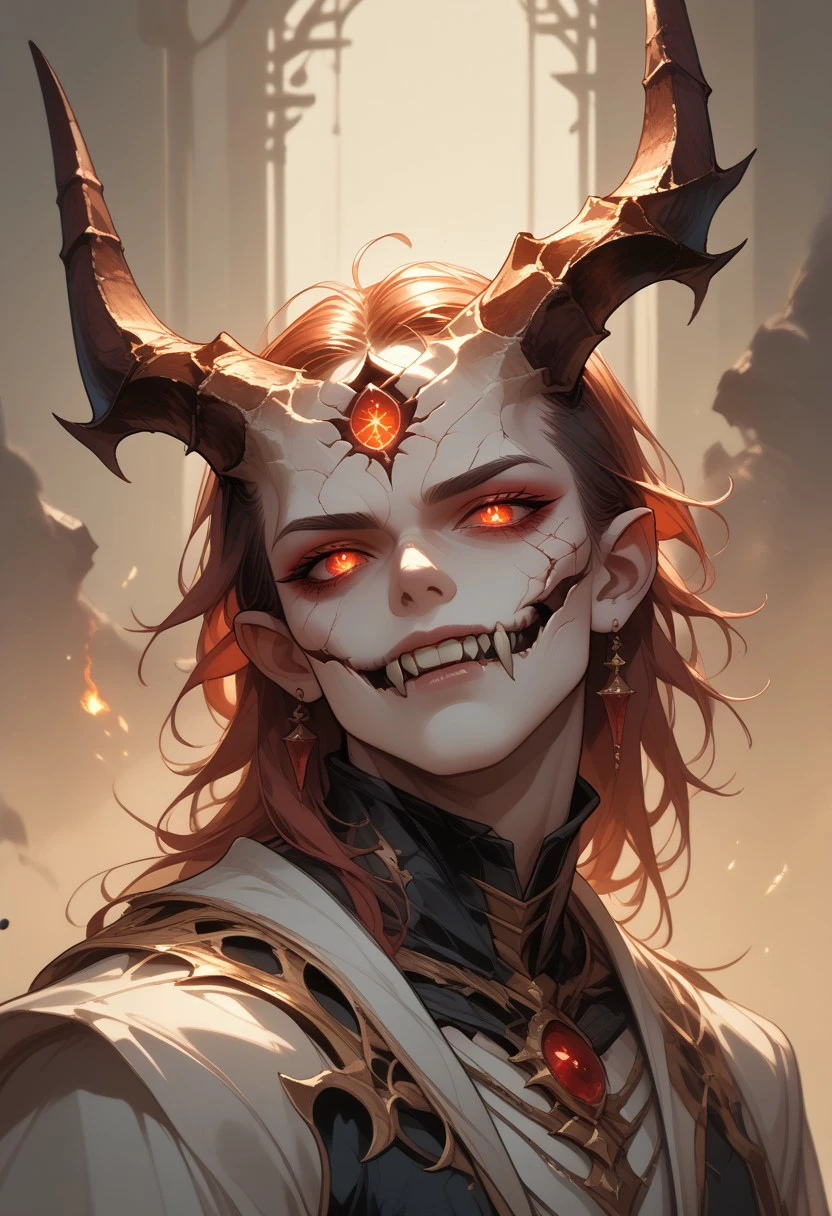 , fibrous skin, burning crimson eyes, Black sclera, broken horns, pointy ears, teeth, fangs,