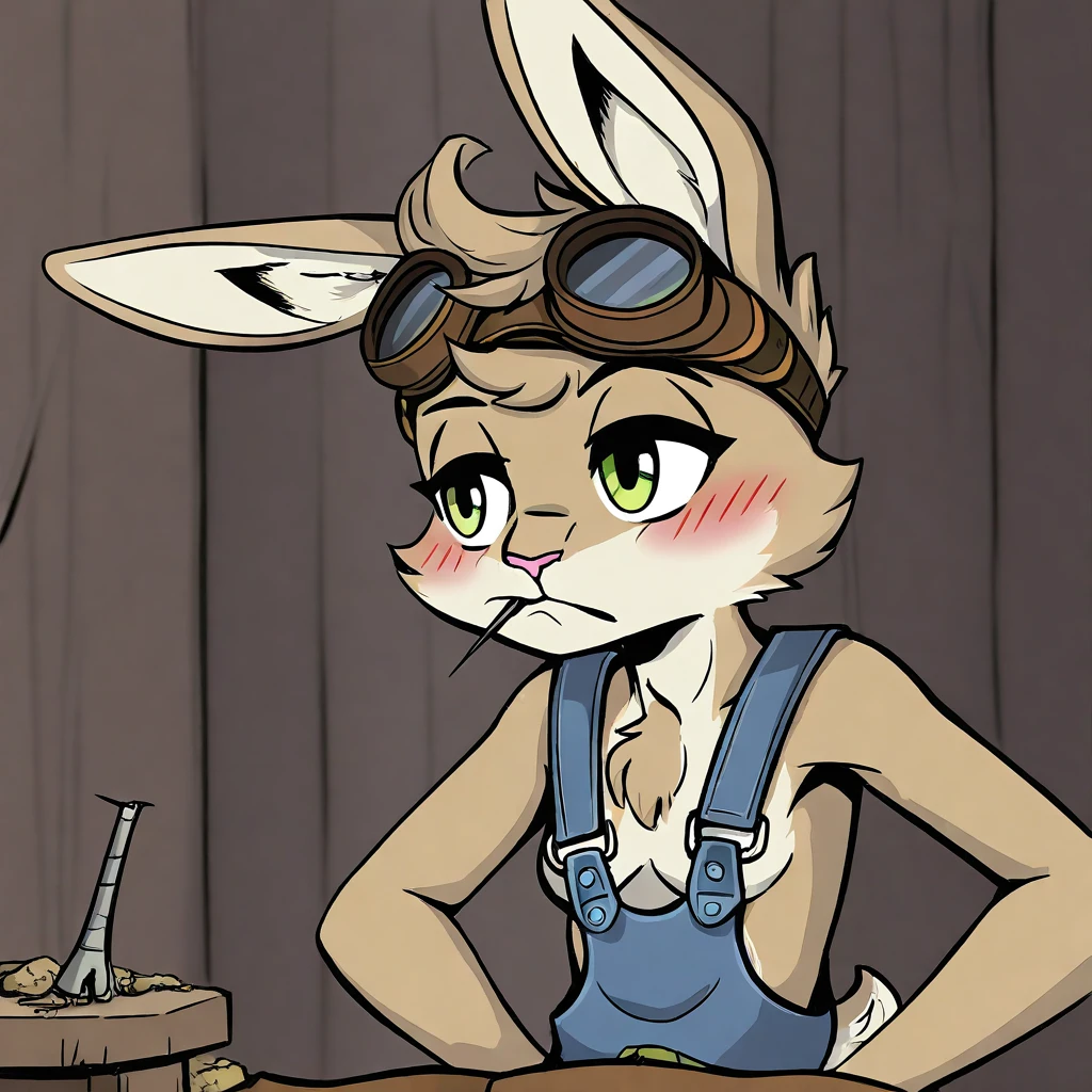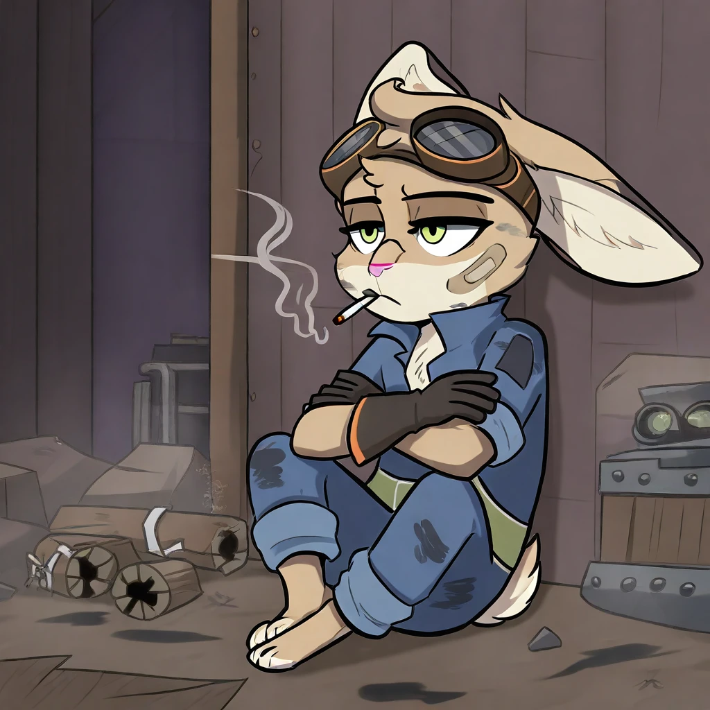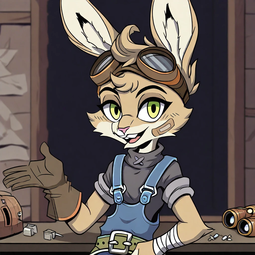 Rivals Outfit: goggles on head, band-aid, black overalls, blue jumpsuit, barefoot, rabbit tail