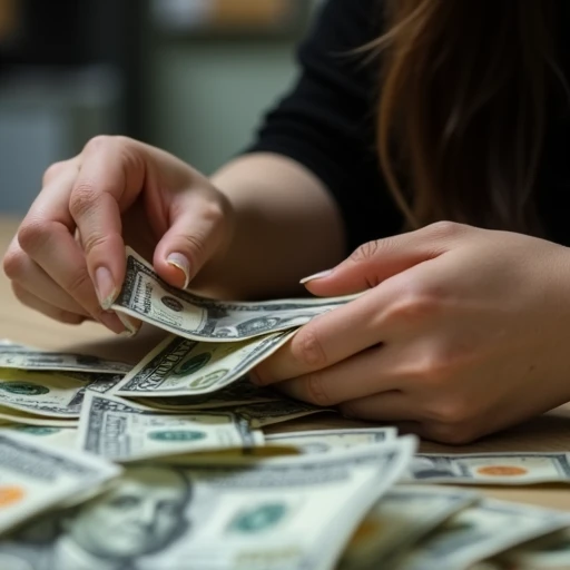 hands, rubber-banded bundles, counting machines, briefcases, scattered on surfaces, thrown in