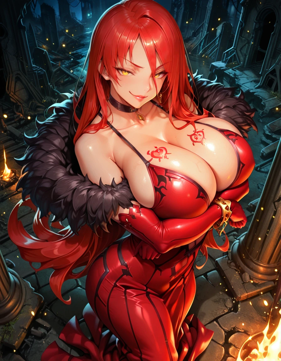 red dress, fur trim, bracelet, elbow gloves, choker, breast tattoo, feather boa, side slit,