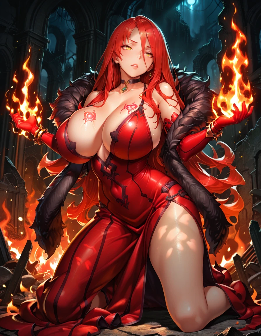 long hair, red hair, very long hair, yellow eyes,