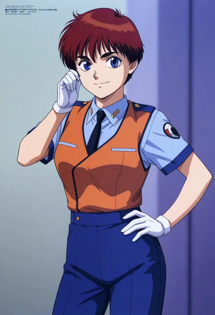 original outfit, patrol uniform, orange vest, uniform vest, double-breasted, white sleeves, collared, white gloves, necktie, blue pants, gaiters, white gaiters, black footwear,