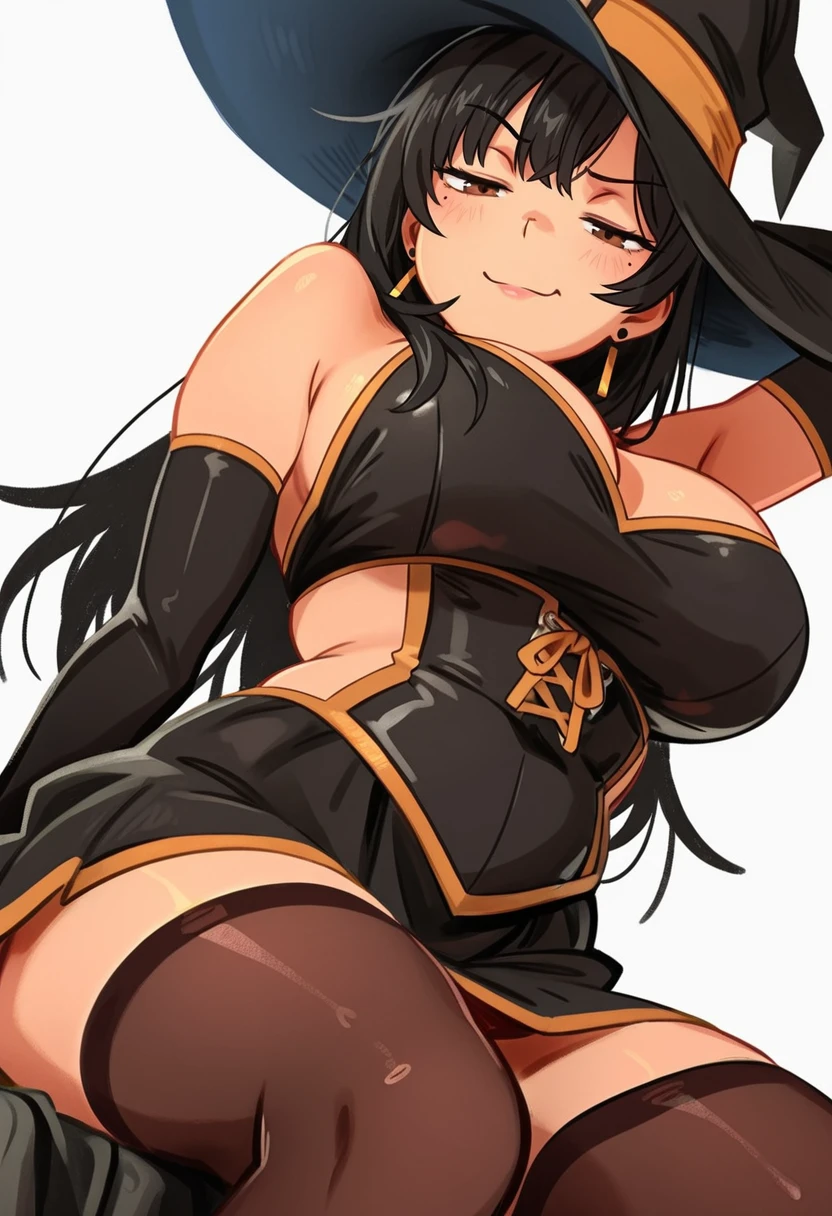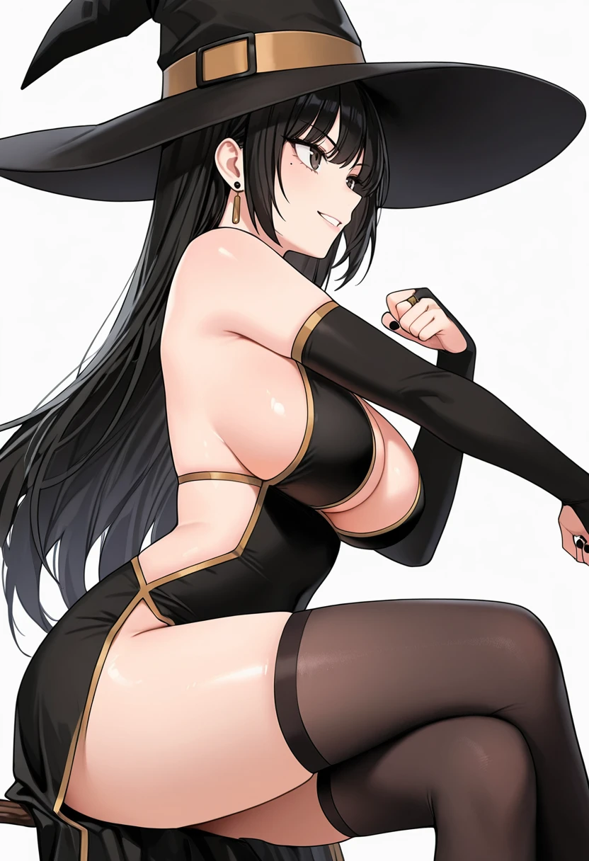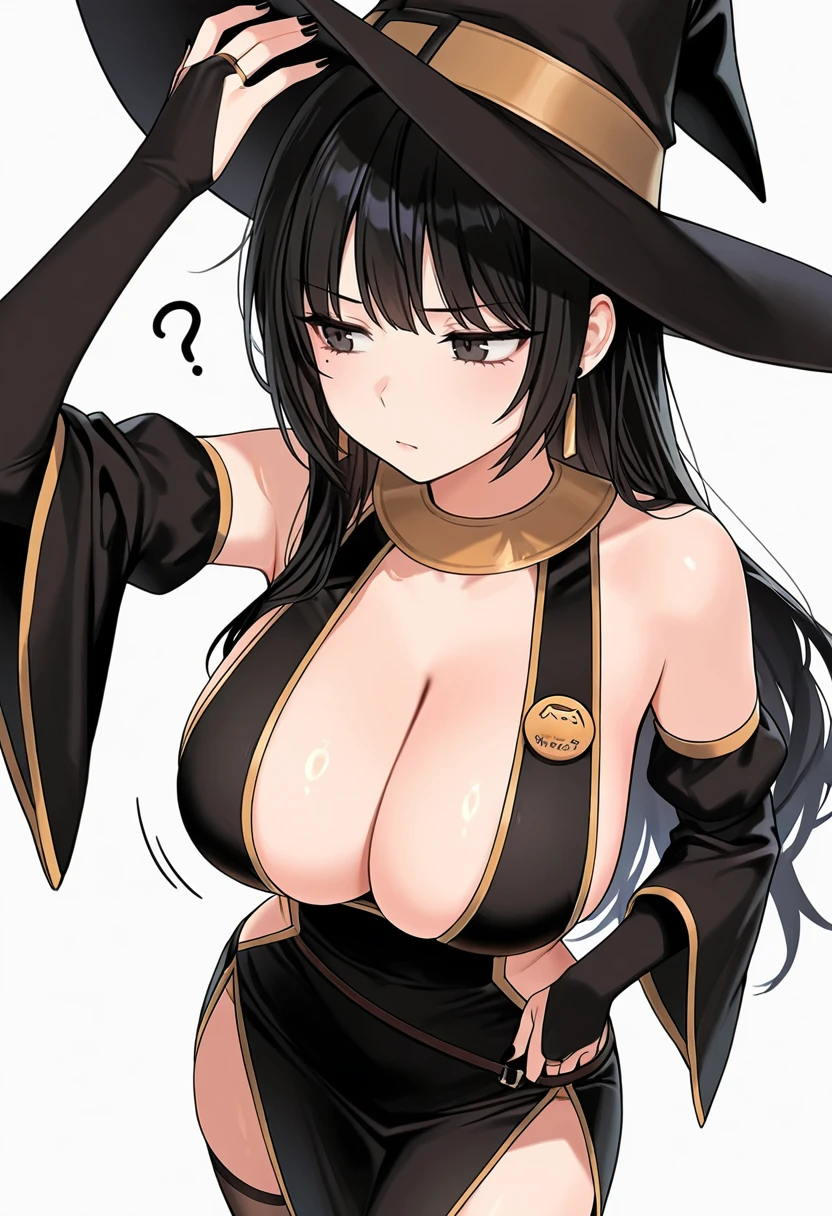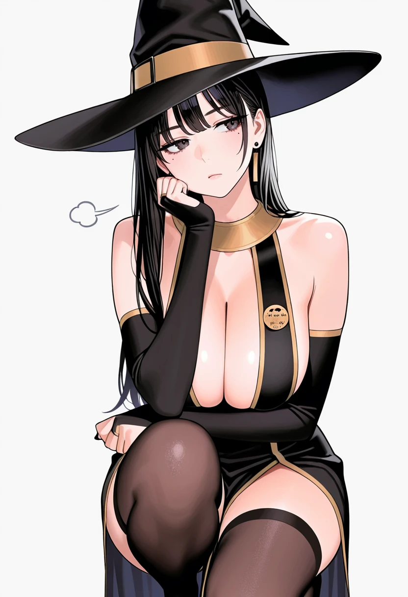 black dress, witch hat,black skirt, bridal gauntlets,elbow gloves, detached sleeves,black thighhighs,earrings,Explanation and notes below👇