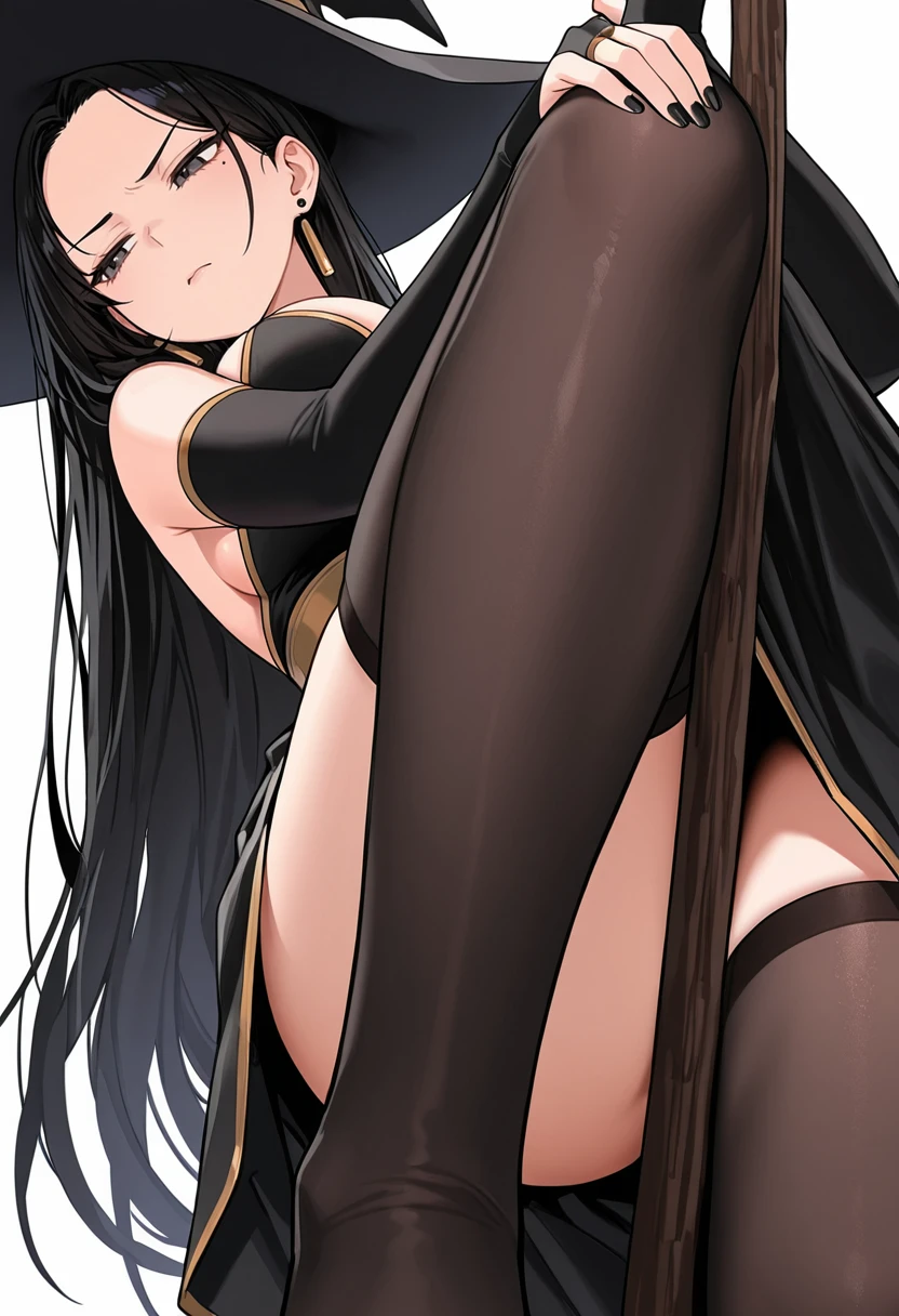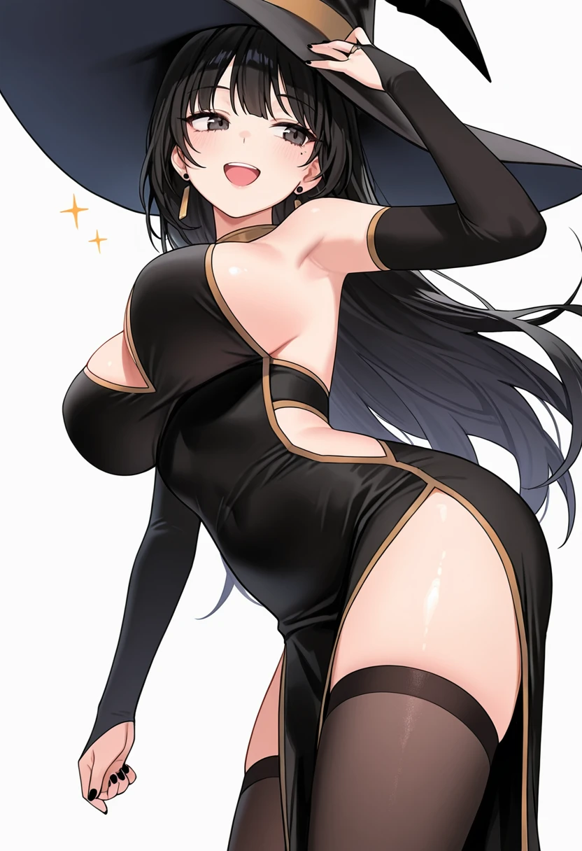 black dress, witch hat,black skirt, bridal gauntlets,elbow gloves, detached sleeves,black thighhighs,earrings,Details