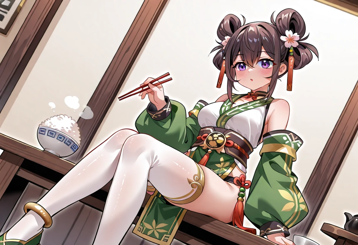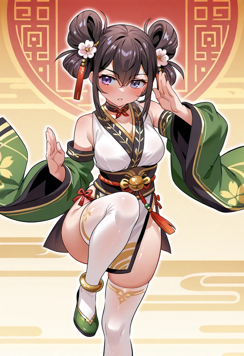 Sun Yiwen, 1girl, solo, brown hair, hair between eyes, double hair bun, hair rings, hair ornament, hair flower, purple eyes, medium breasts