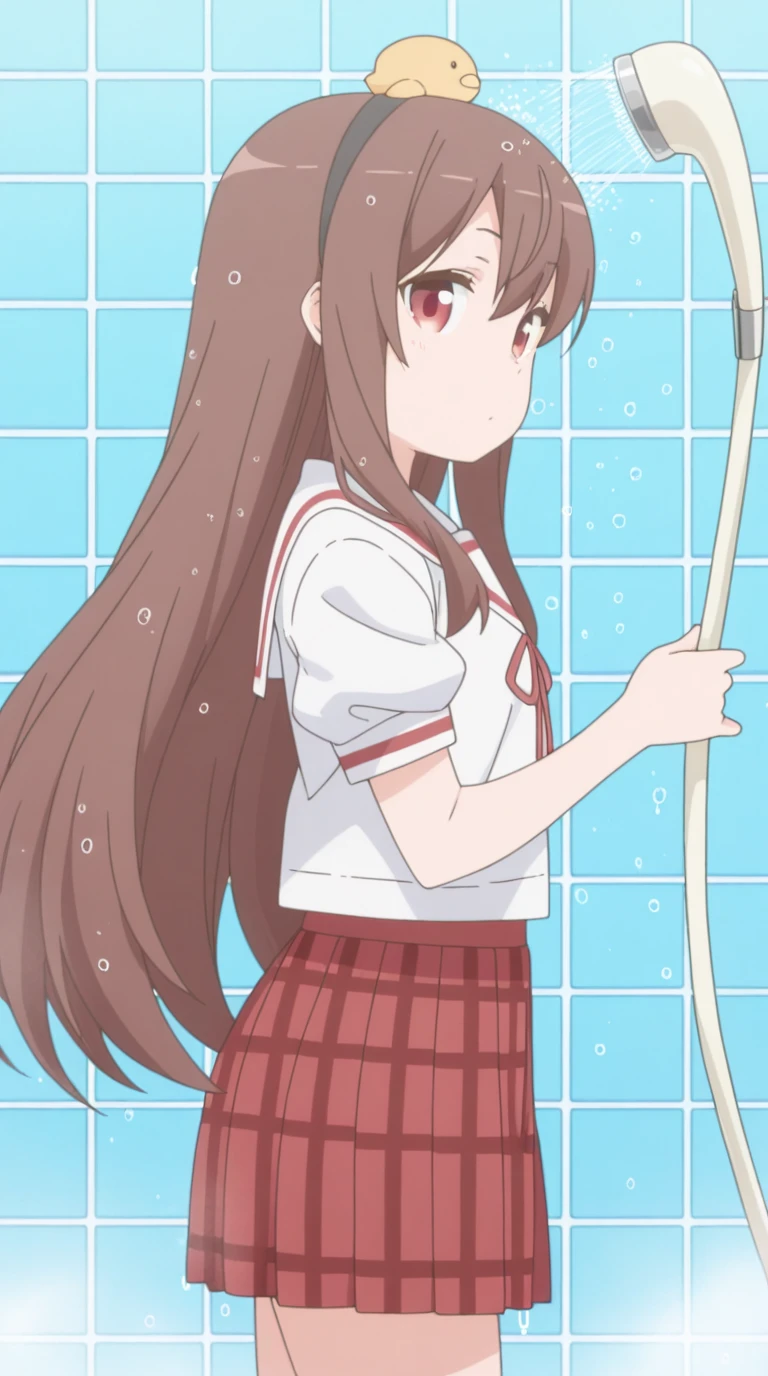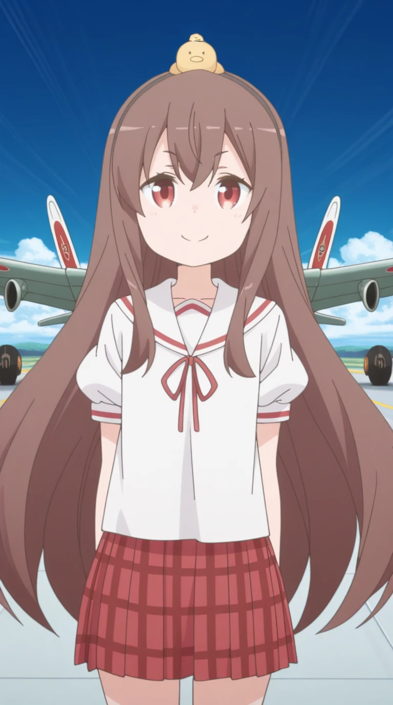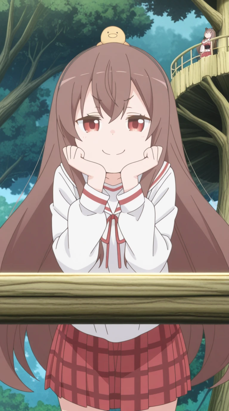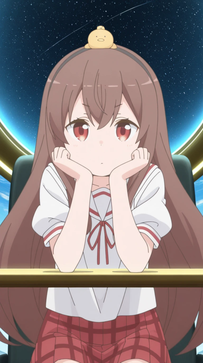 yuzu yukimoto, long hair, brown hair, red eyes, hairband, bird, on head, animal on head, chick, anime screencap
