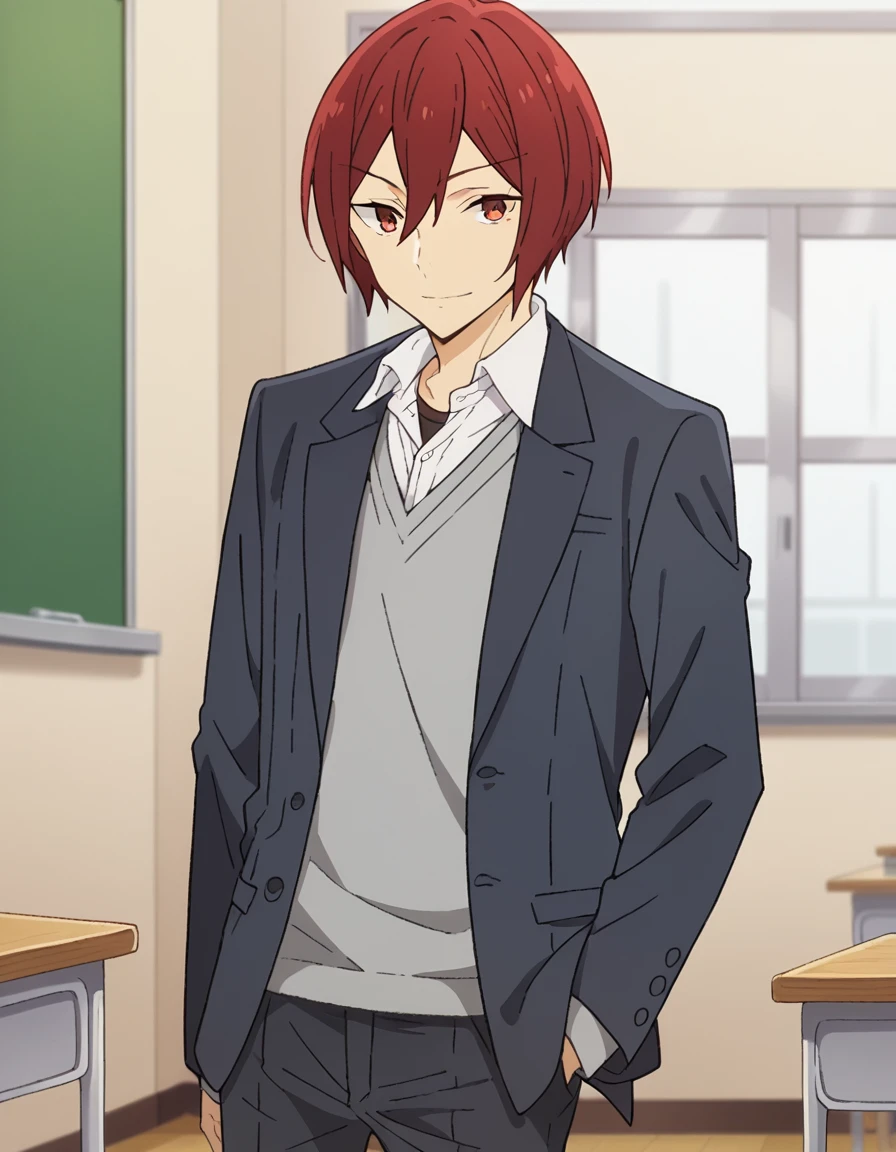 shirt, long sleeves, school uniform, jacket, white shirt, open clothes, collared shirt, pants, sweater, open jacket, black jacket, blazer,