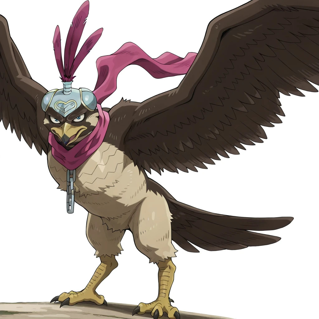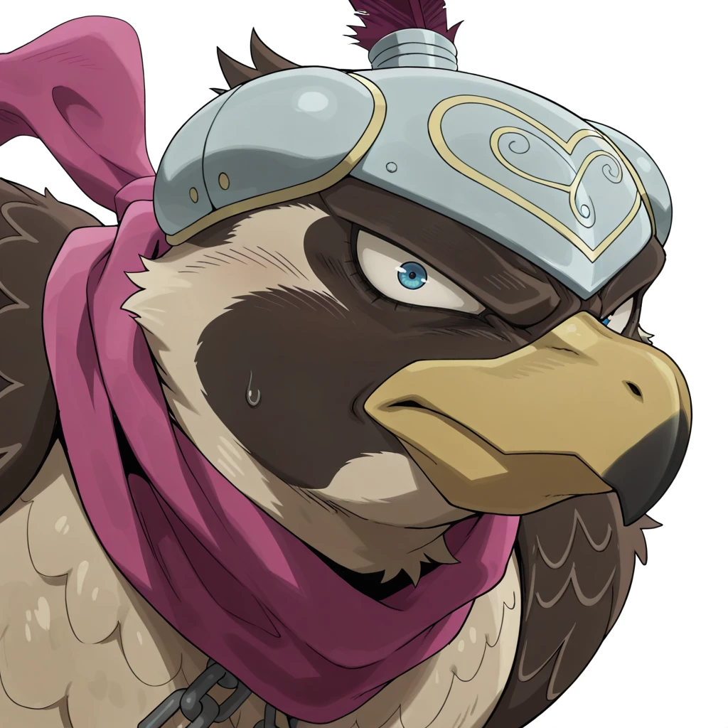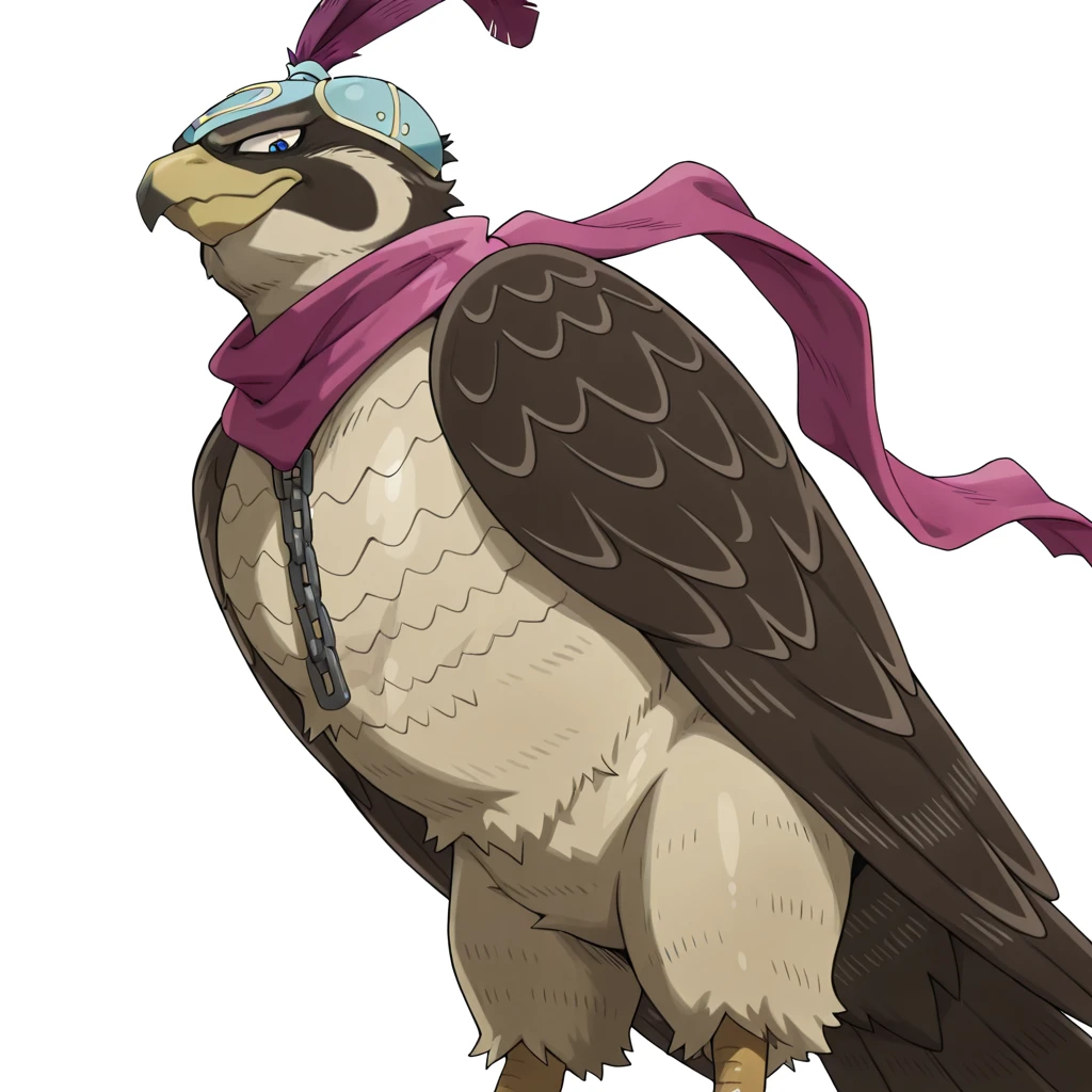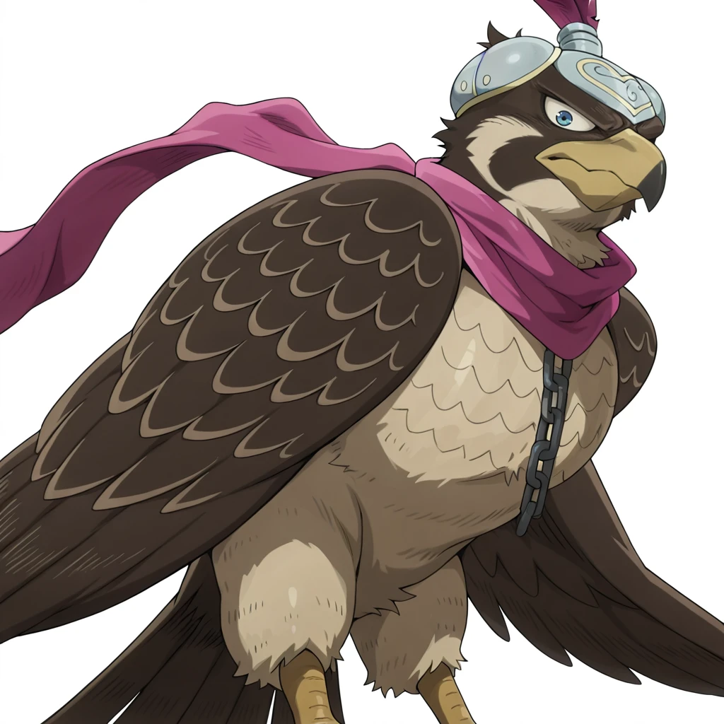 1boy, male, furry, feral, bird, falcon, solo, brown feathers, two-tone feathers, blue eyes, yellow beak, nostrils, yellow feet, talons, wings, tailfeathers
