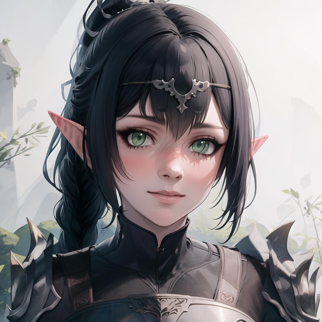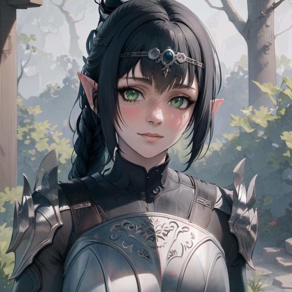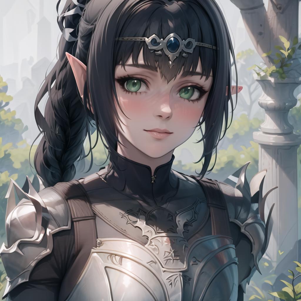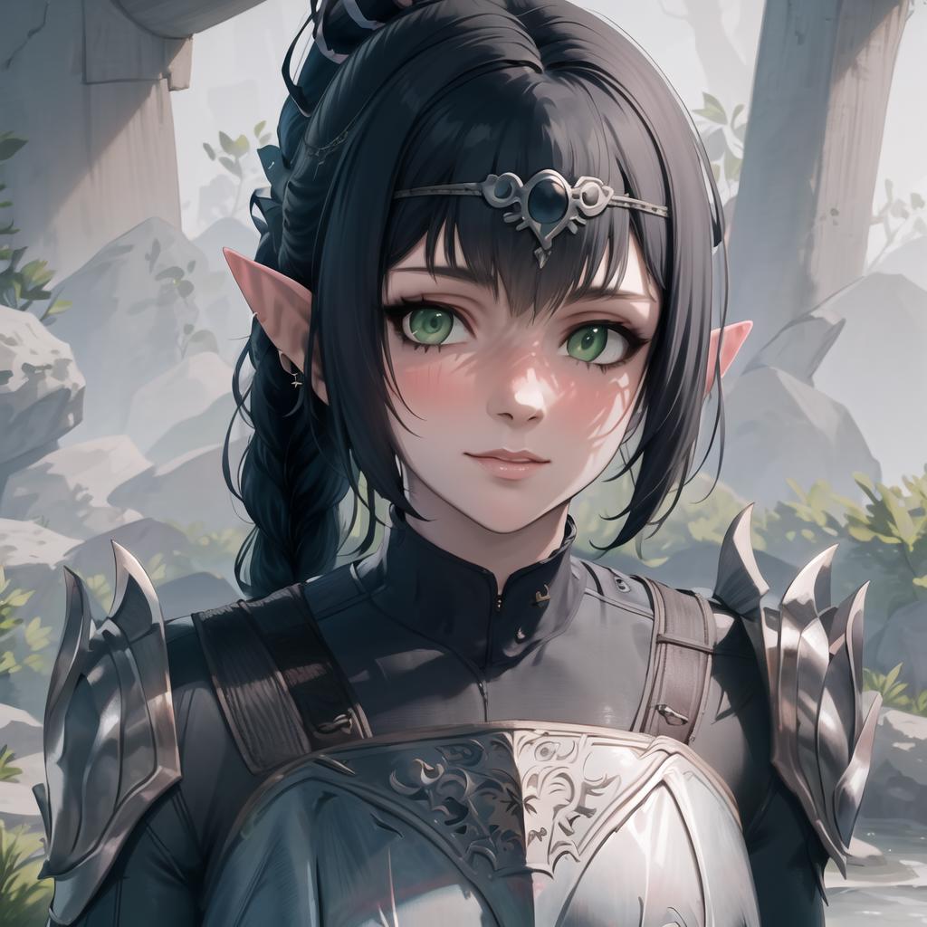Shadowheart, armor, black hair, pointy ears, bangs, circlet, ponytail, green eyes, braid
