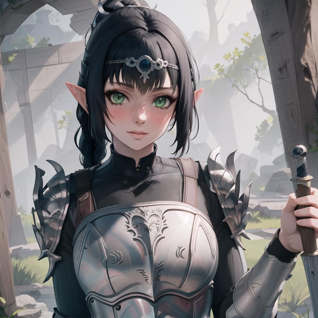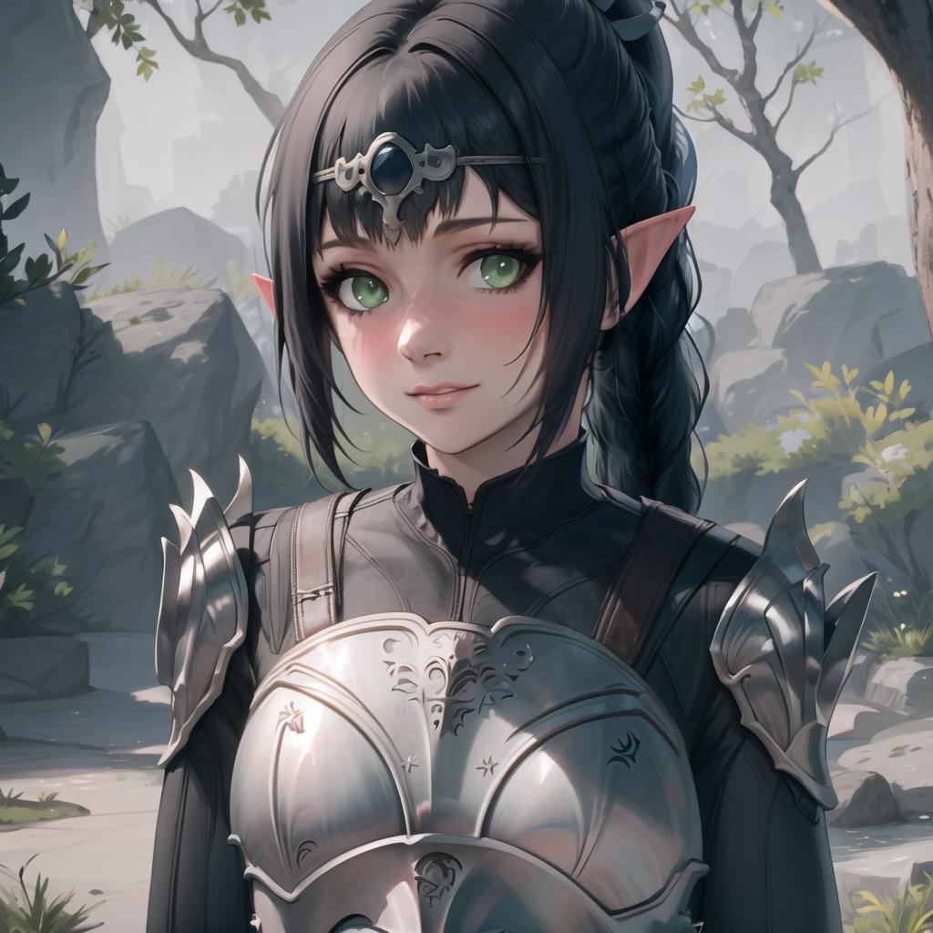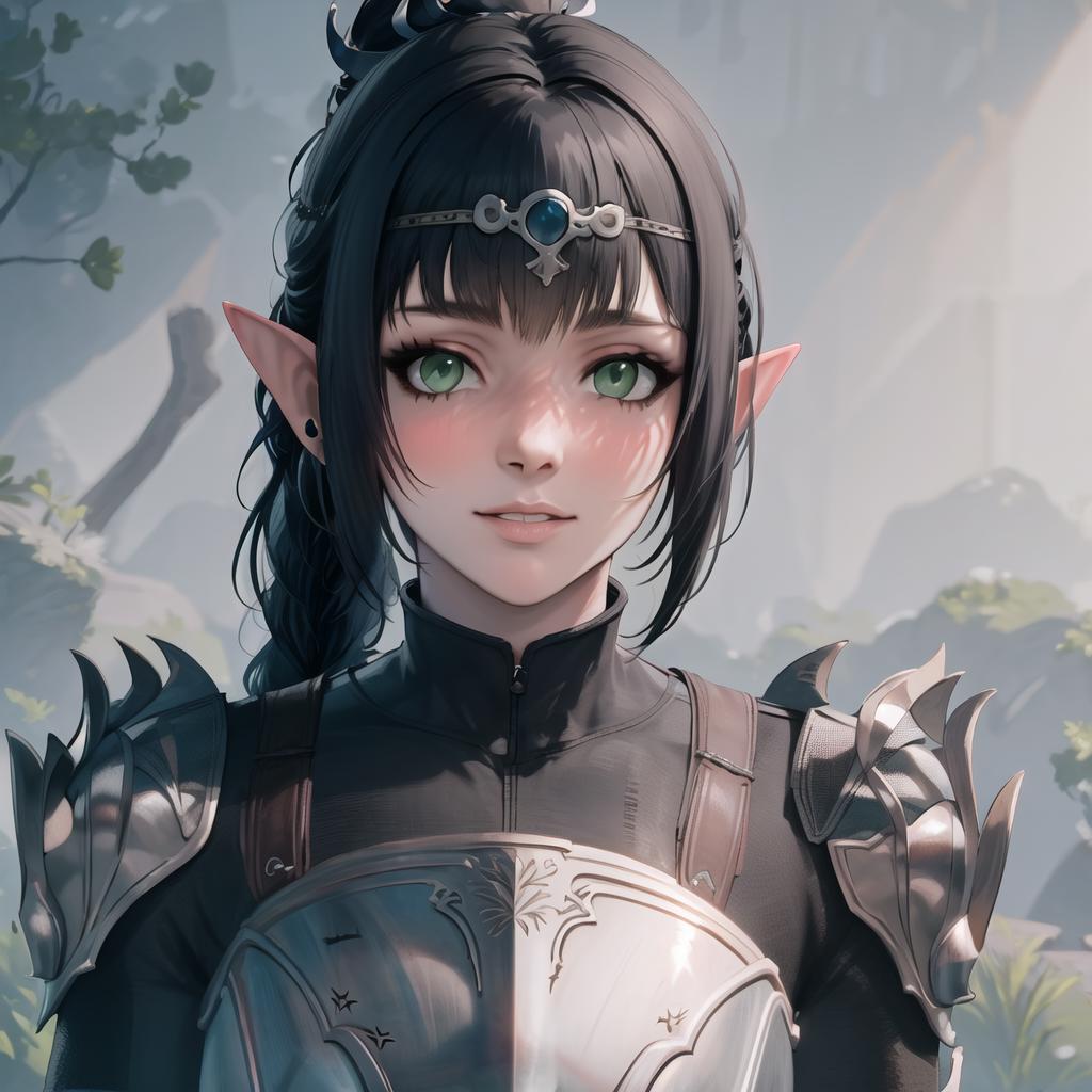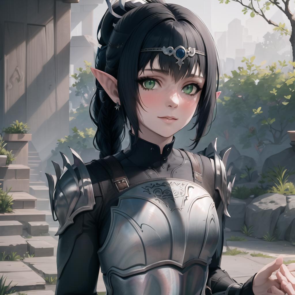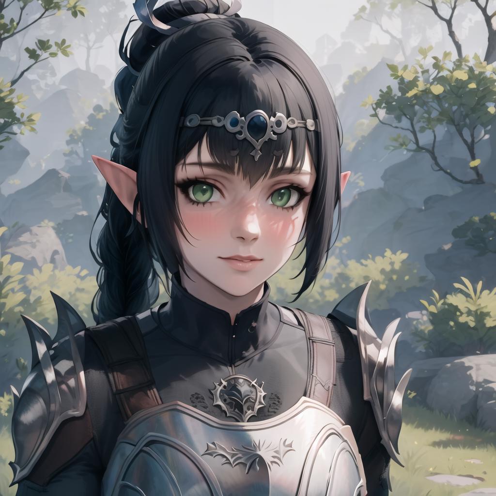 Shadowheart, armor, black hair, pointy ears, bangs, circlet, ponytail, green eyes, braid