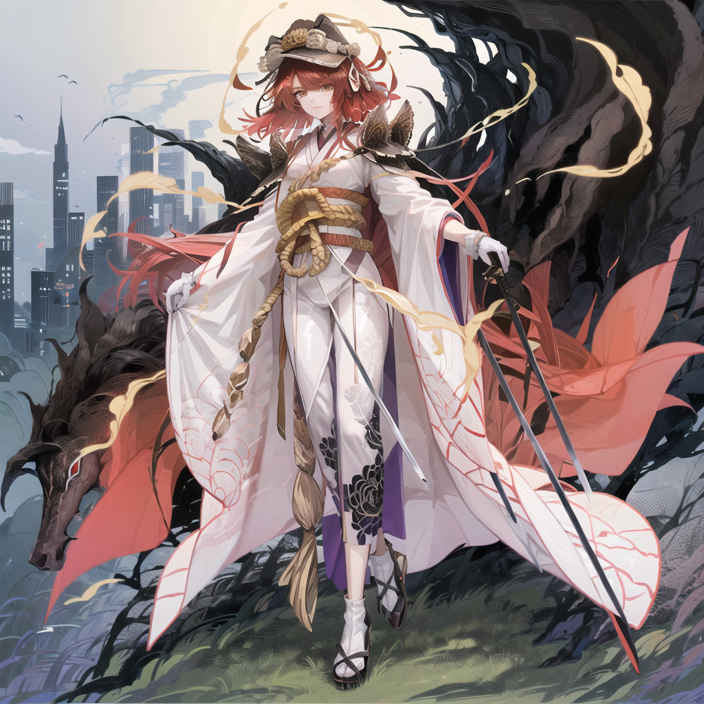 a woman has short red hair and is holding a sword, 1girl, sword, solo, red hair, weapon, japanese clothes, holding sword, long hair, hat, holding, gloves, white gloves, full body, wide sleeves, holding weapon, sash, katana, room background,