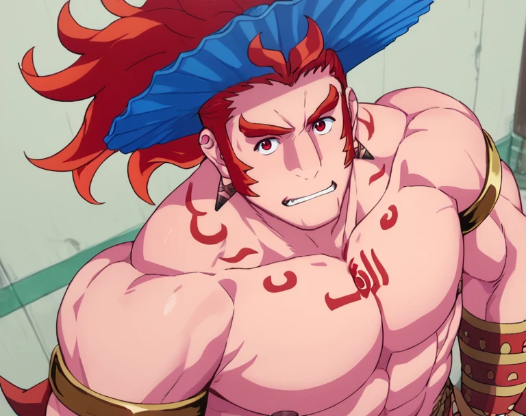 Senya, mature, man , muscular , red hair , red eyes , tatto, mature man, manly , front view, bara, male focus