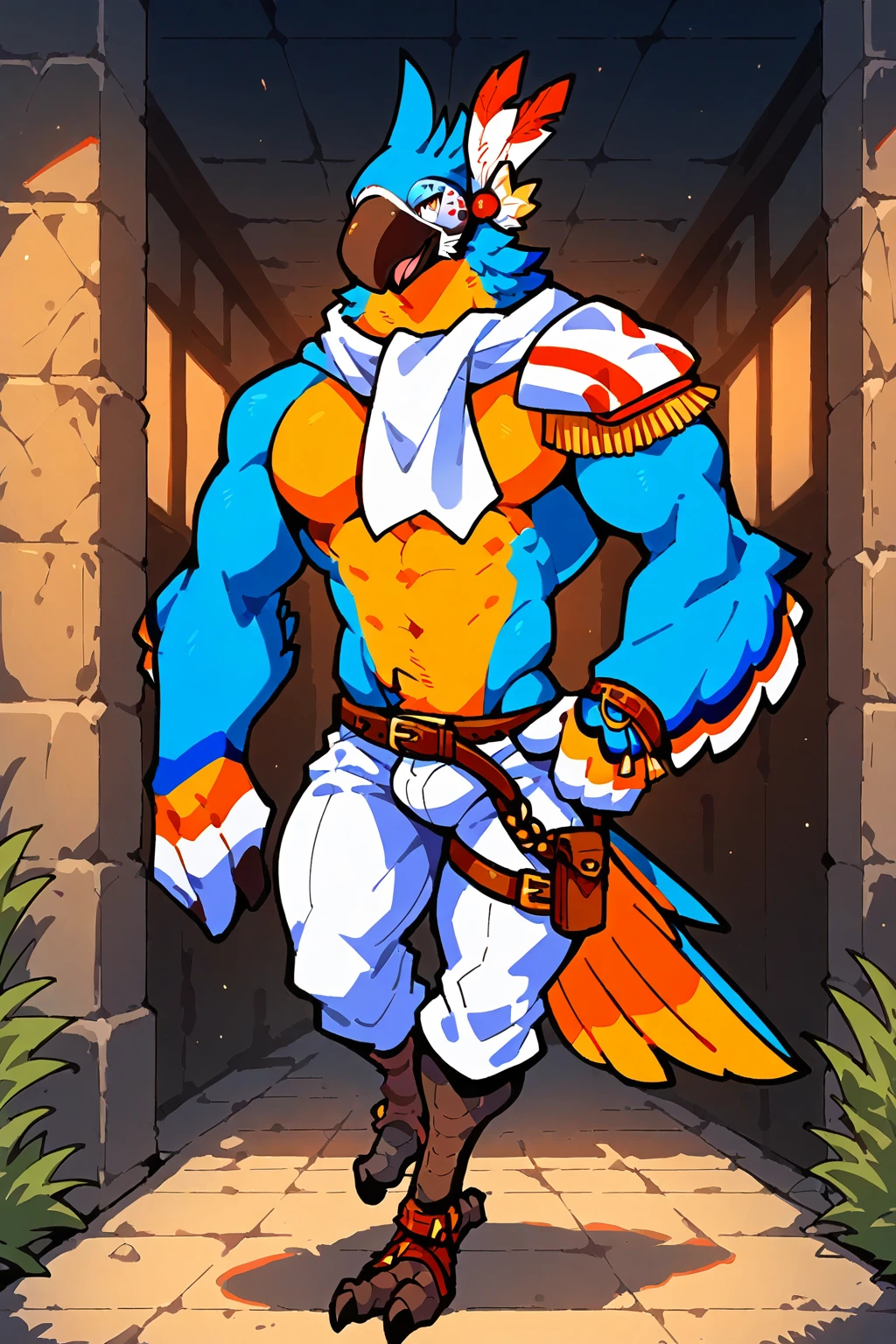 For her Outfit: white scarf, stripped shoulder pads, white pants, belt, feather headpiece