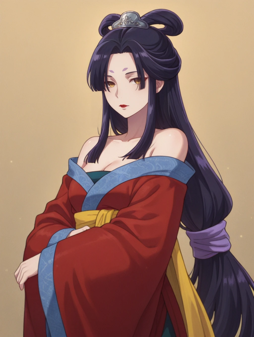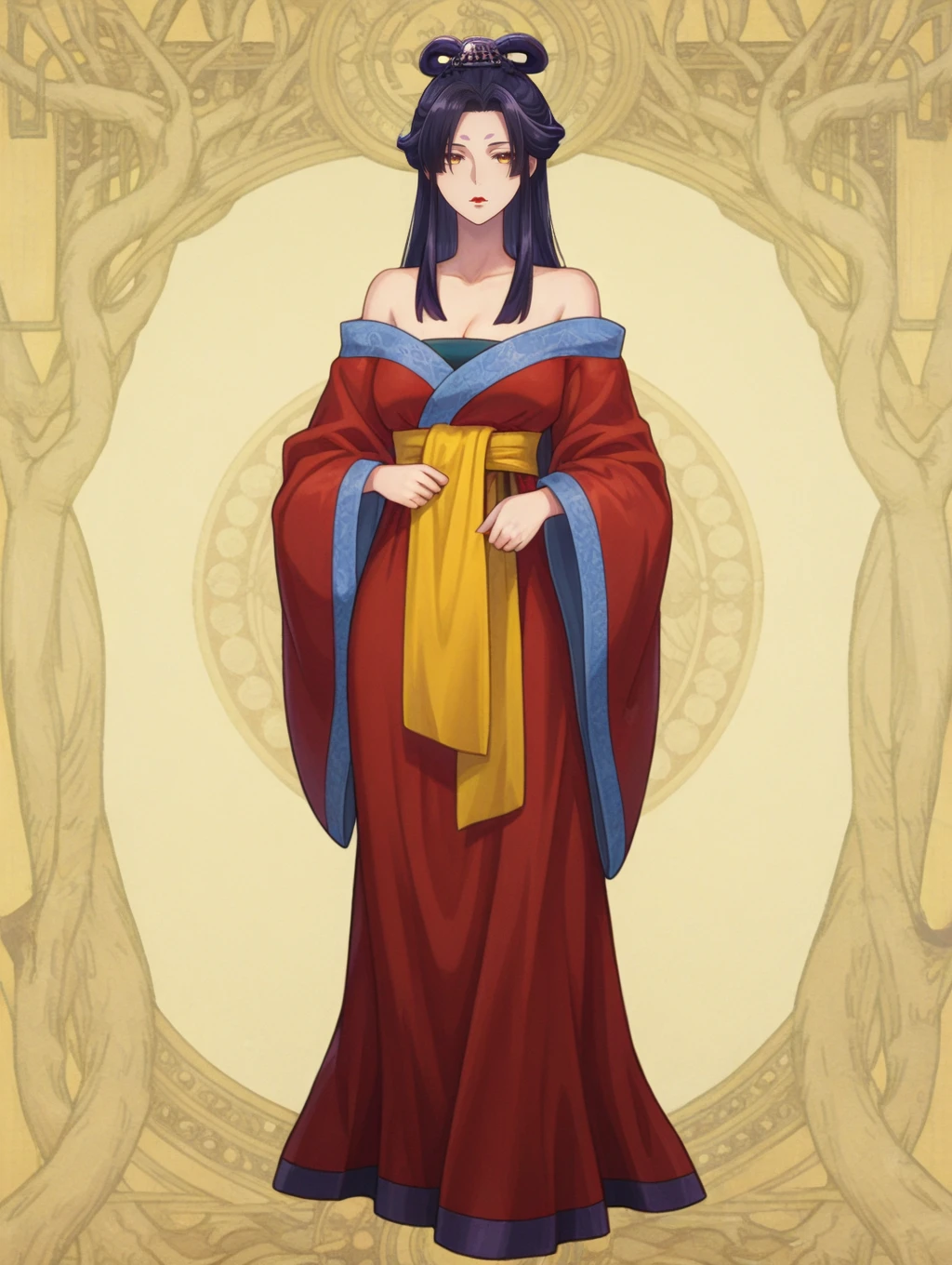ywnw,purple hair,long hair,parted bangs,sidelocks,half updo,hair rings,hair ornament,yellow eyes,forehead mark,red lips,bare shoulders,red hanfu,yellow sash,wide sleeves,low-tied long hair,