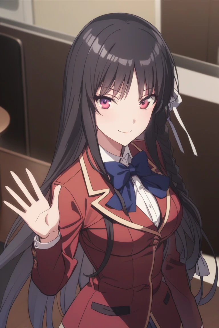 horikita suzune, red eyes, purple eyes, long hair, black hair, hair ribbon