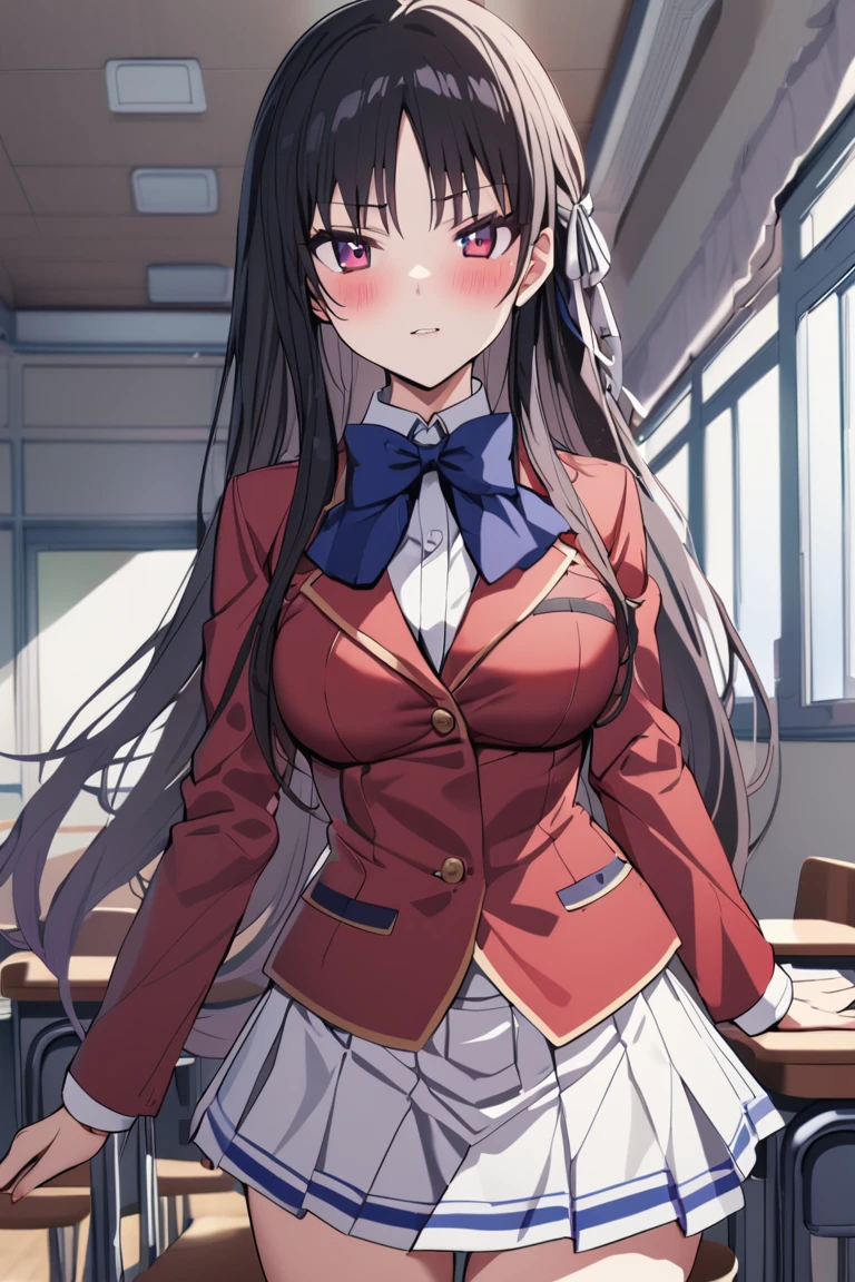 For Clothing: ``school uniform, bow tie, red jacket, white skirt, pleated skirt,``
