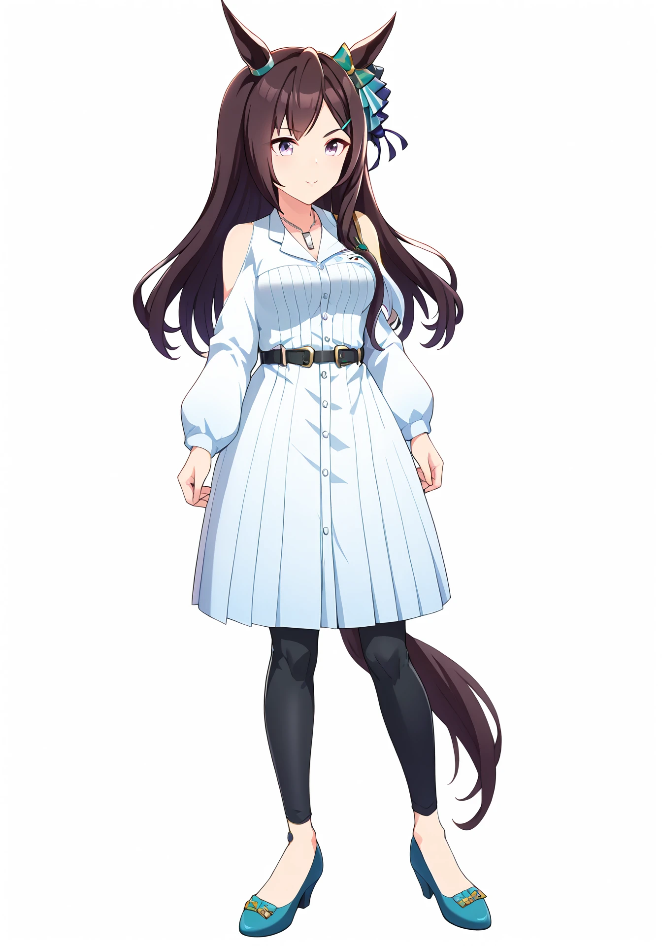 MDcasual,white dress,shoulder cutout,black leggings,white necklace,black belt,cyan pumps,green ear ornament,green hair clip,parted bangs