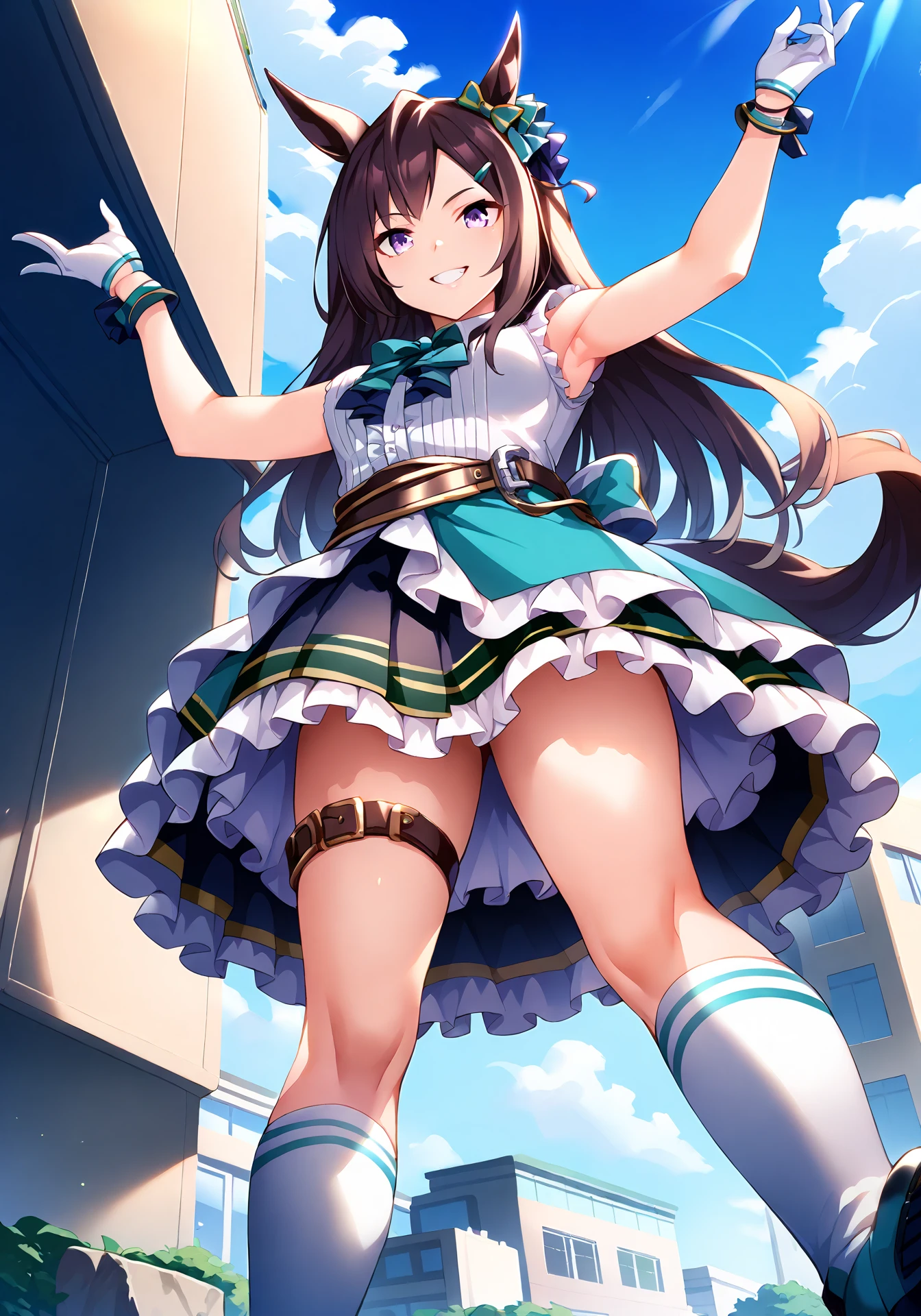 MDschoolLong,tracen school uniform,parted bangs,green hair ornament,green hair clip,white bow,back bow,horseshoe ornament,purple sailor shirt,long sleeves,purple pleated skirt,purple thighhighs,brown footwear