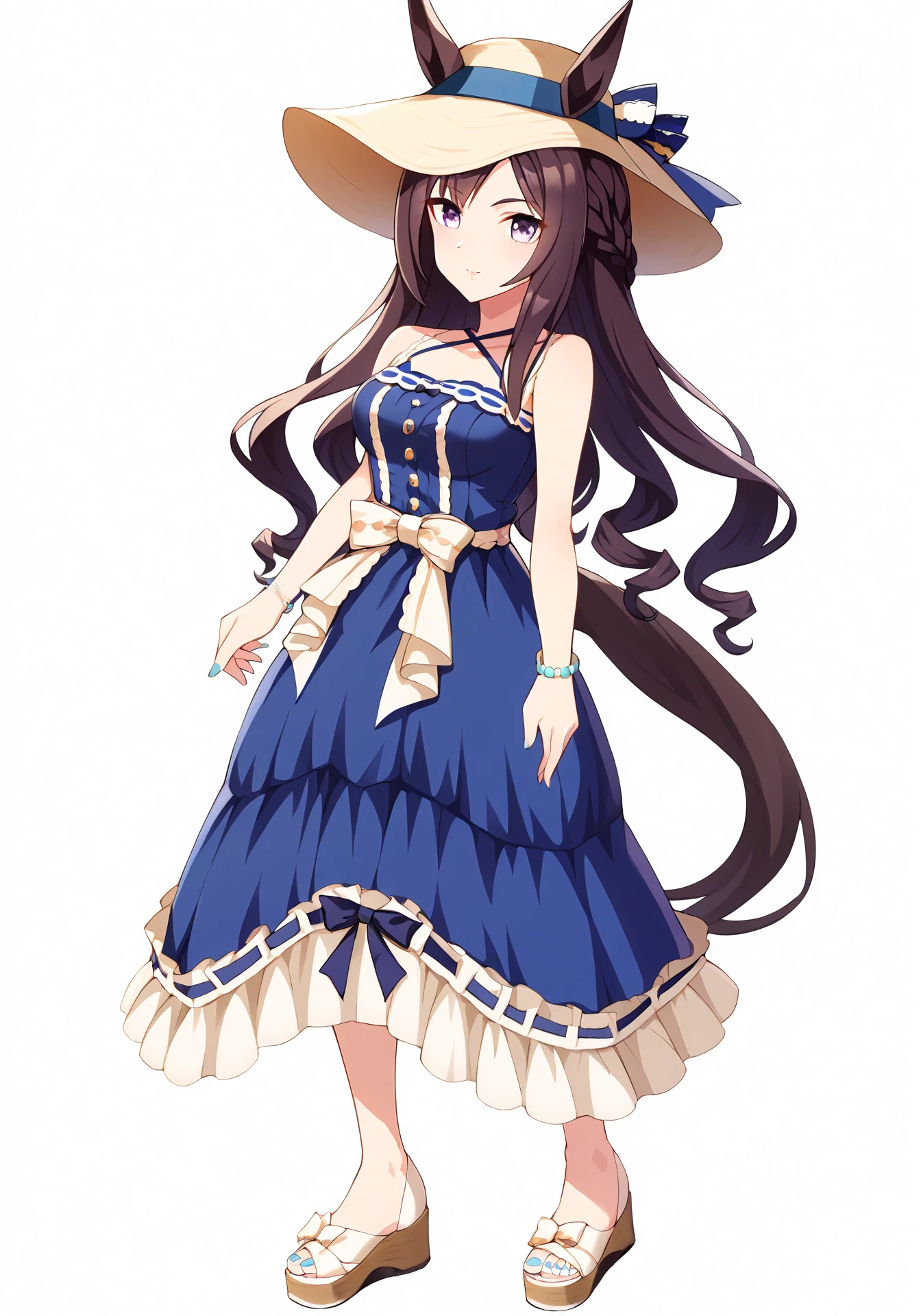 MDSaphir,blue sleeveless dress,sun hat,bracelet,platform sandals,white waist bow,parted bangs,crown braid,aqua toenails,aqua nails,ears through headwear