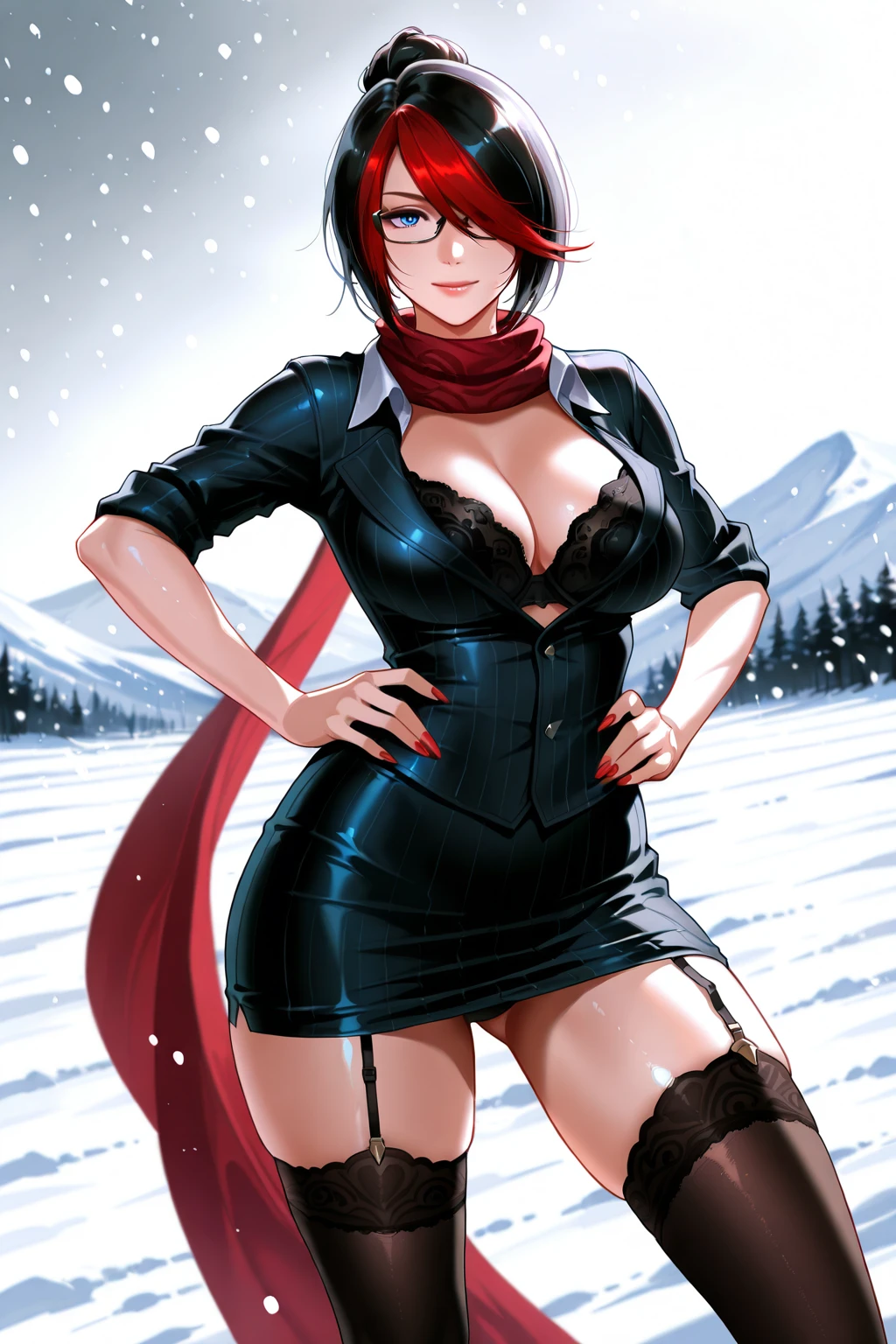 fiora (league_of_legends), Fiora Laurent, short hair, hair bun, black hair, red hair, multicolored hair, hair over one eye, swept bangs, blue eyes, glasses, under-rim eyewear, black thighhighs, black skirt, striped clothes, black jacket, makeup, garter straps, black bra, sleeves rolled up, pencil skirt, vertical-striped clothes, black-framed eyewear, red scarf, lace-trimmed legwear, lace-trimmed bra