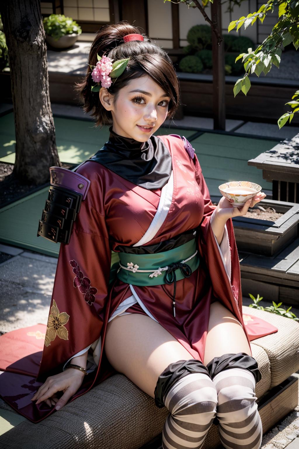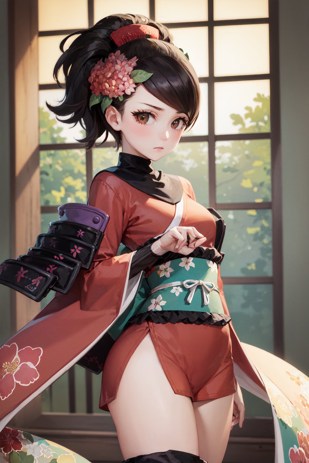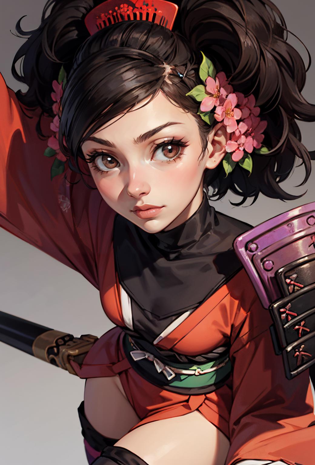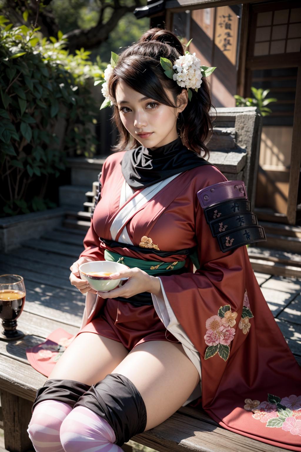 Default Outfit: hair flower, japanese clothes, armor, kimono, thighhighs