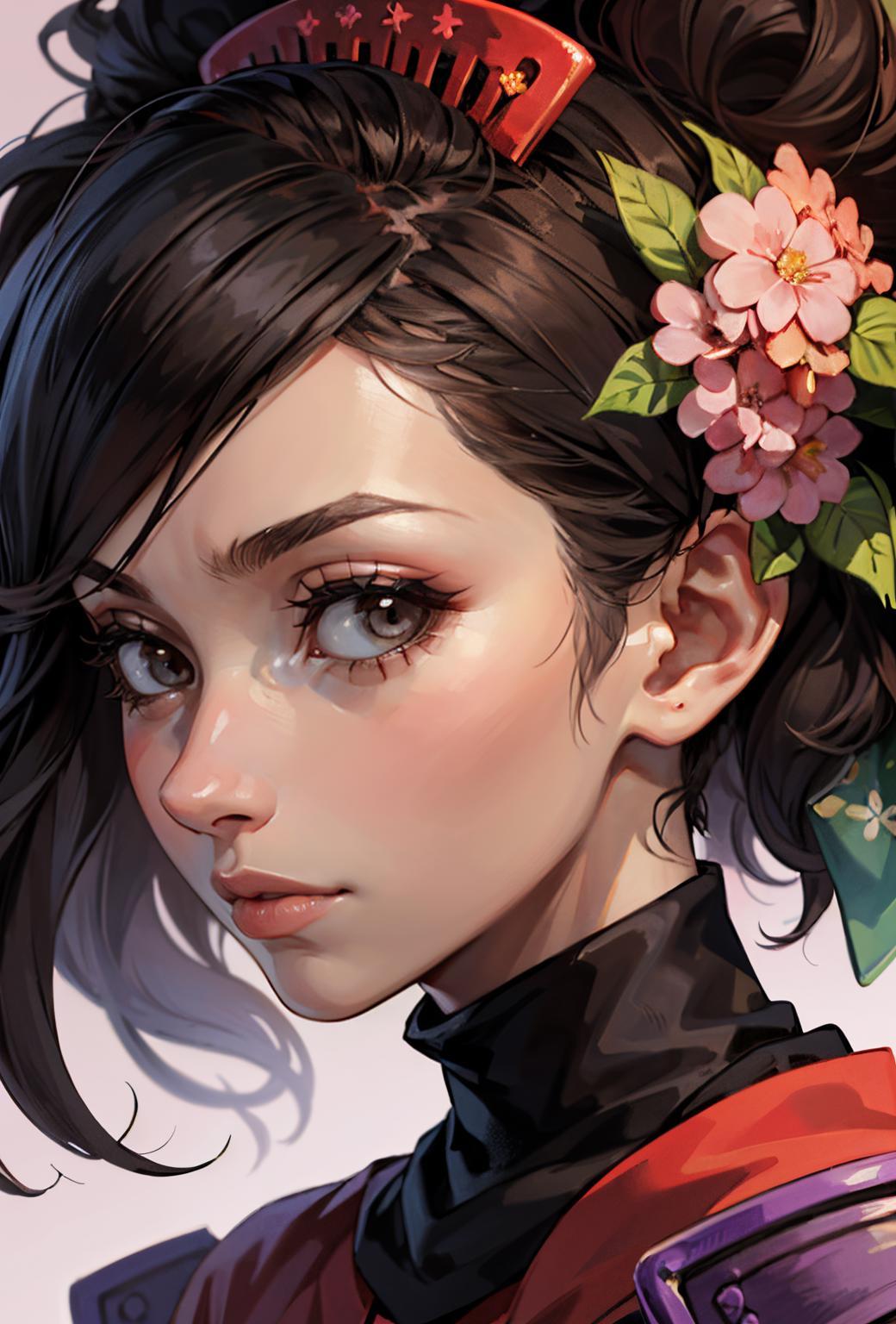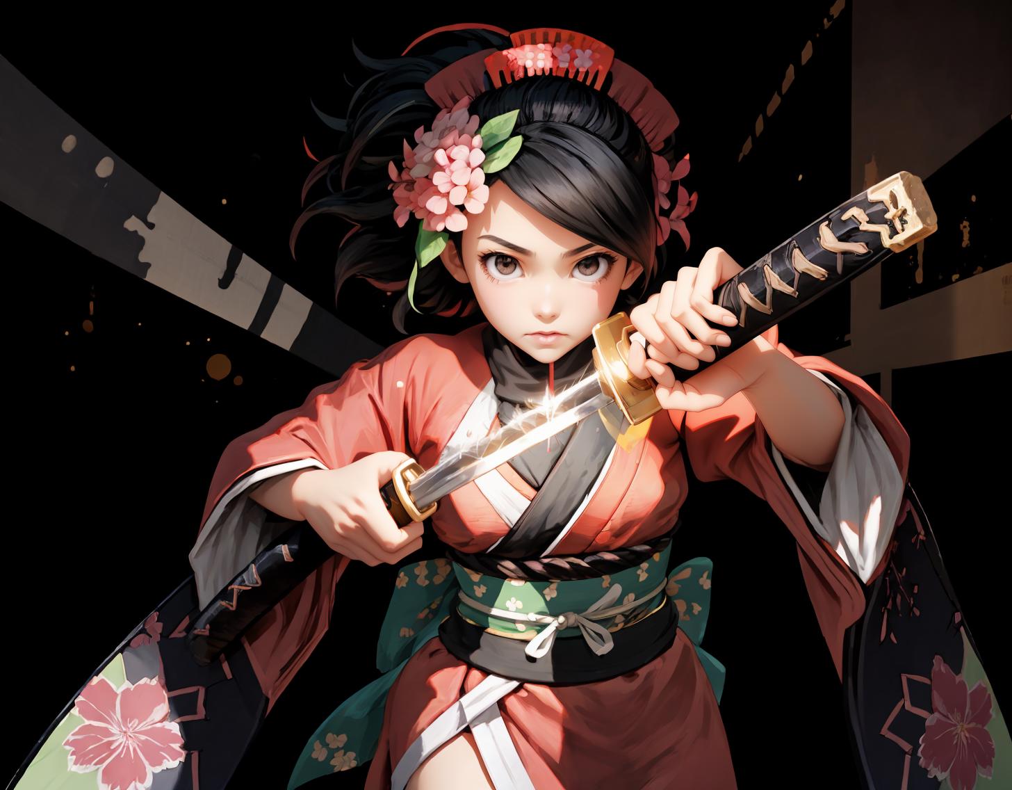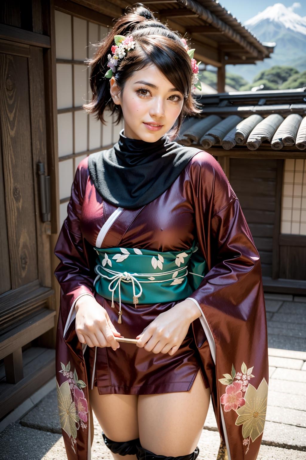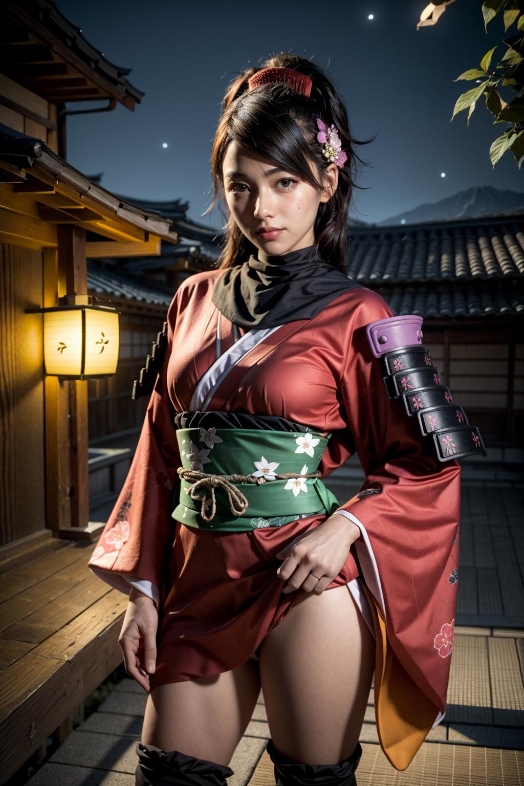 Default Outfit: hair flower, japanese clothes, armor, kimono, thighhighs