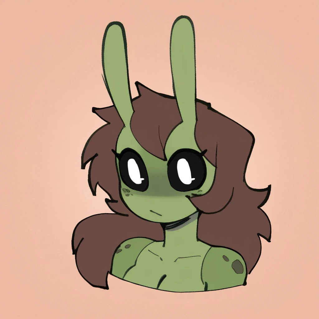 Pavizi, Alien girl, green body, brown hair, black eyes, white pupils, long hair, antennae,