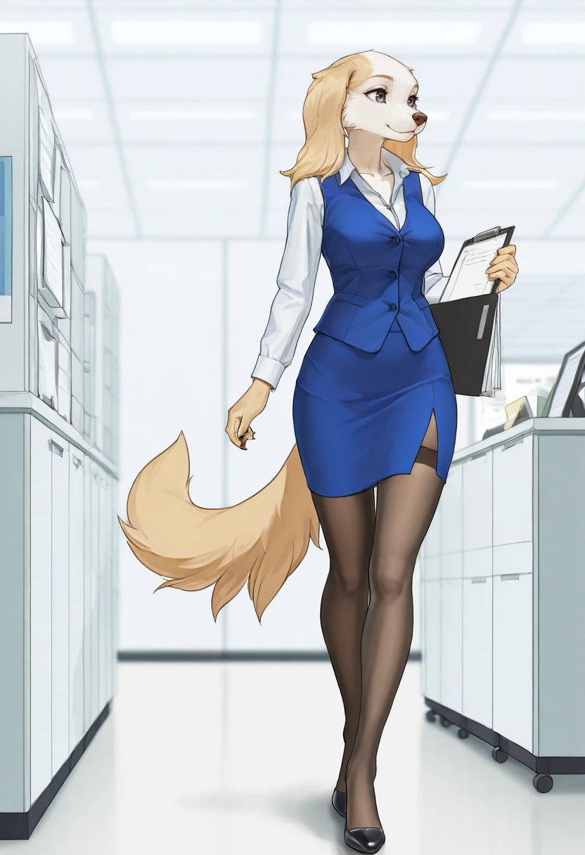 Office Outfit: Blue vest, Blue skirt, White dress shirt, Stockings, high heels