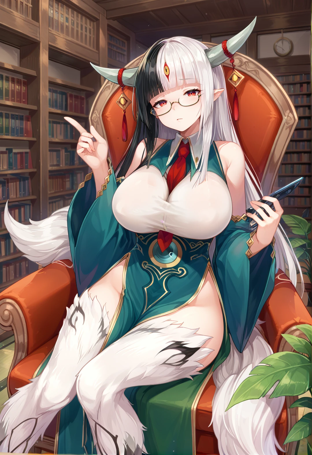 HakutakuMGE, blunt bangs, long hair, large breasts, red eyes, black hair, white hair, two-tone hair, monster girl, third eye, necktie between breasts, horns, sleeveless, wide sleeves, horn ornament, fur, tail, pelvic curtainoption : hooves, under-rim eyewear