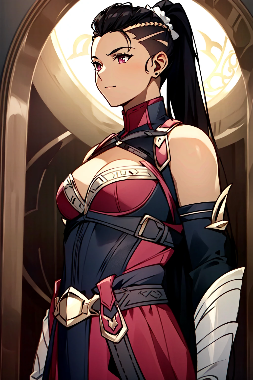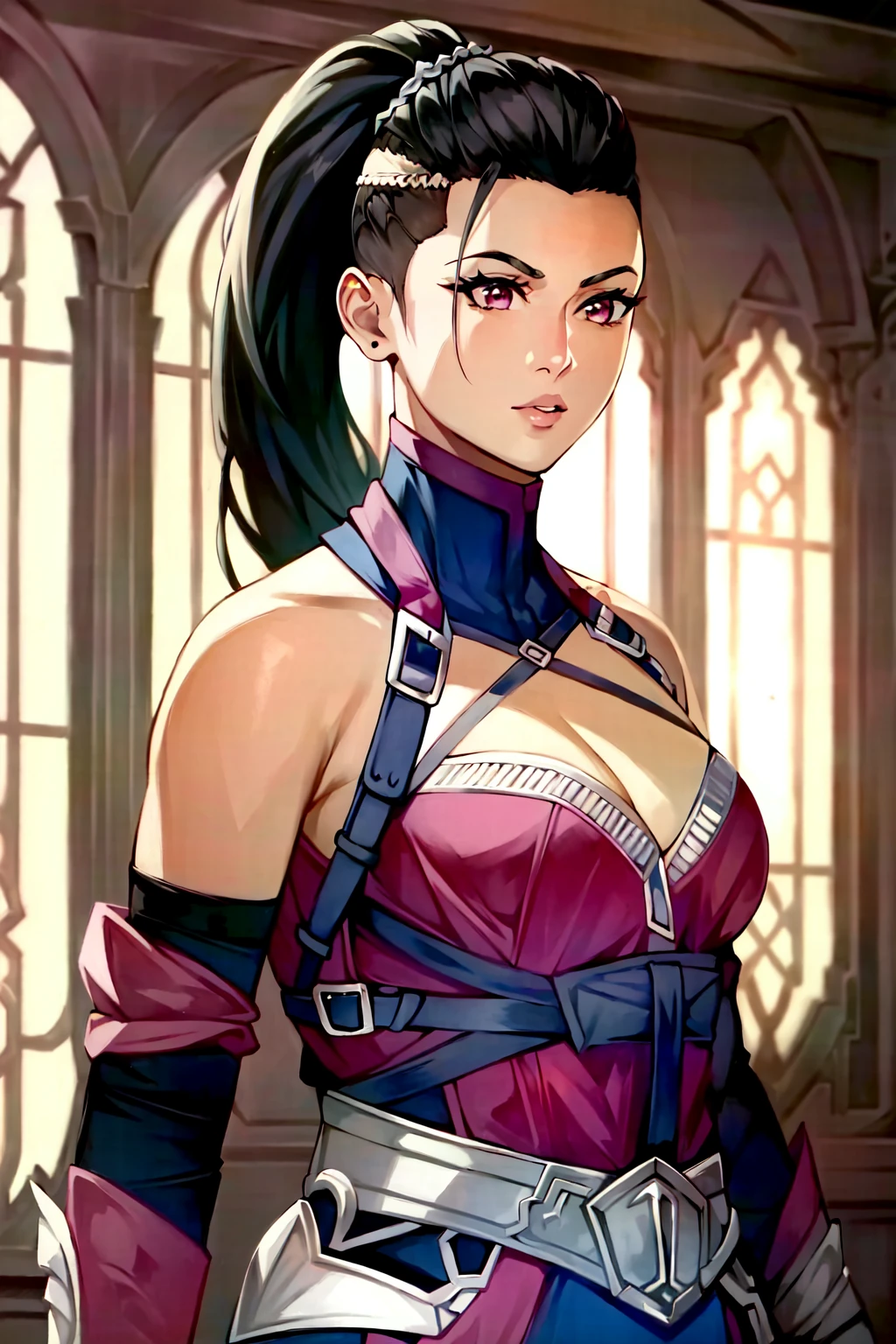 Mileena, human form, human, 1girl, breasts, solo, gloves, black hair, long hair, cleavage, fingerless gloves, bare shoulders, elbow gloves, medium breasts, ponytail, front hump ponytail, shaved sides with ponytail, medium breasts, leggings