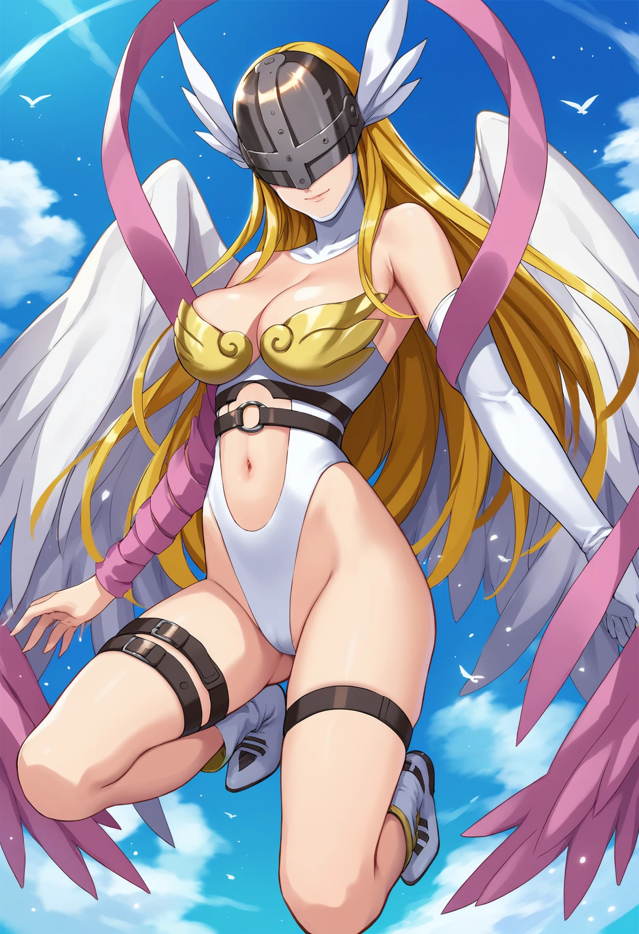 costume: blonde hair, wings, white footwear, hagoromo, leotard, asymmetrical clothes, thigh strap, large breasts,