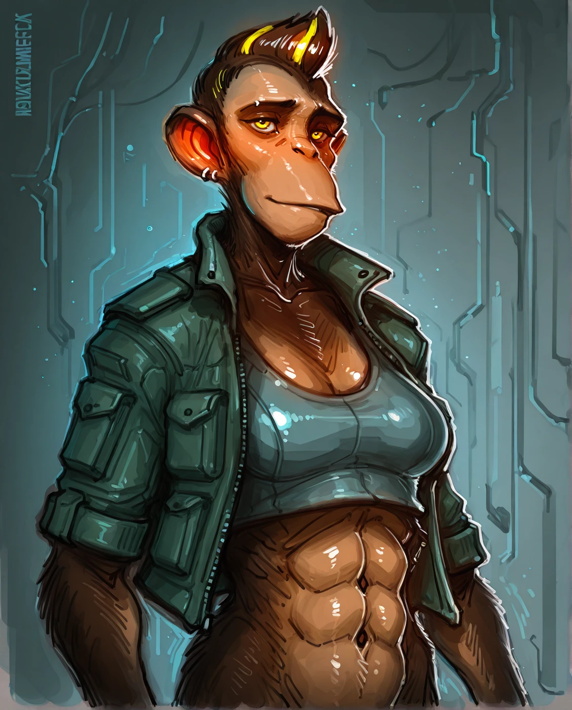 y3llo, chimpanzee, yellow eyes, black hair, striped hair, brown fur, (abs:0.8), prehensile feet