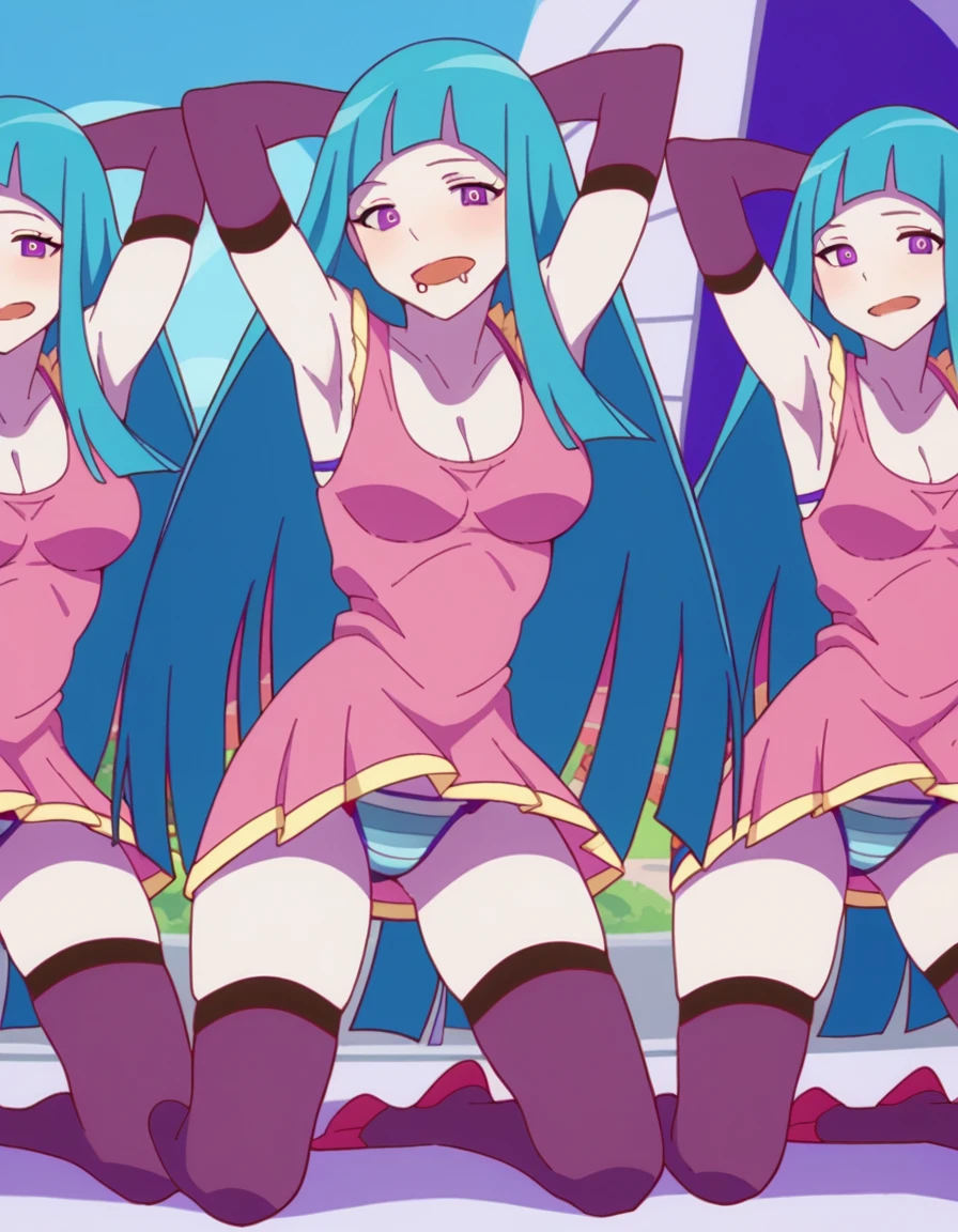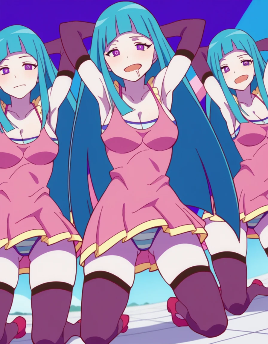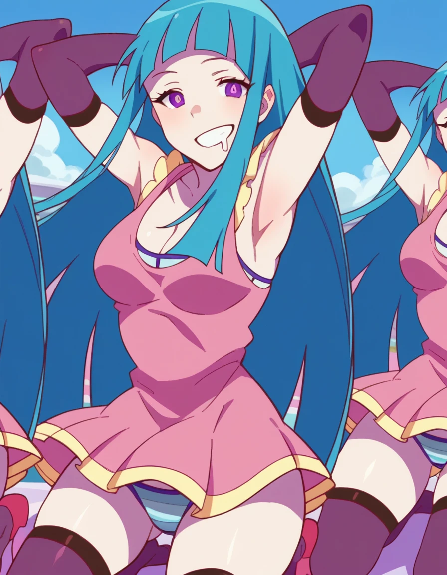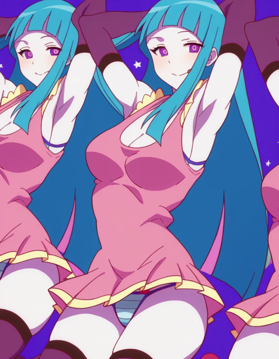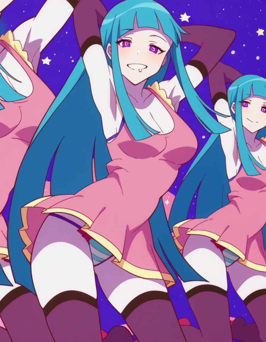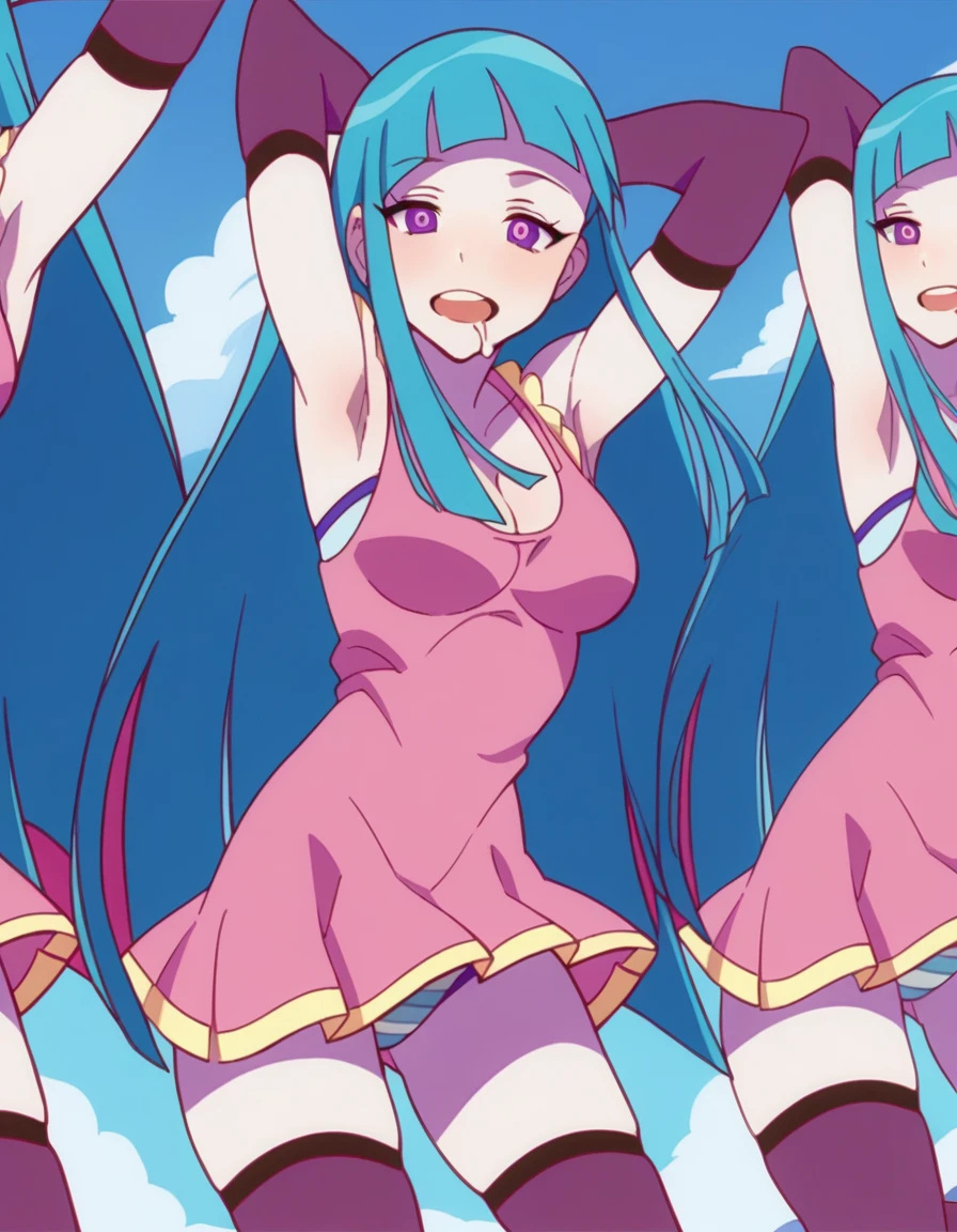 meme, long hair, very long hair, blue hair, purple eyes, bangs, blunt bangs,