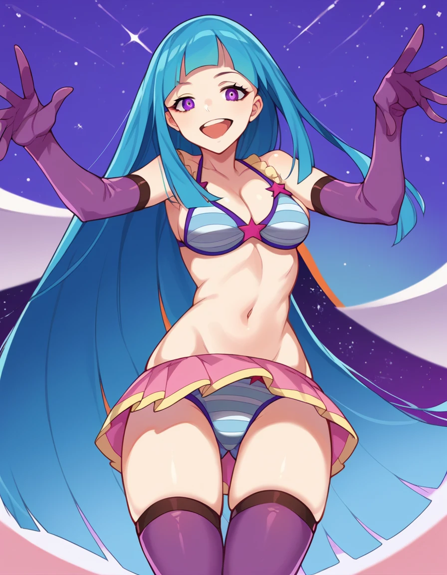 thighhighs, gloves, cleavage, swimsuit, bikini, elbow gloves, striped, striped bikini, purple thighhighs, navel, midriff,