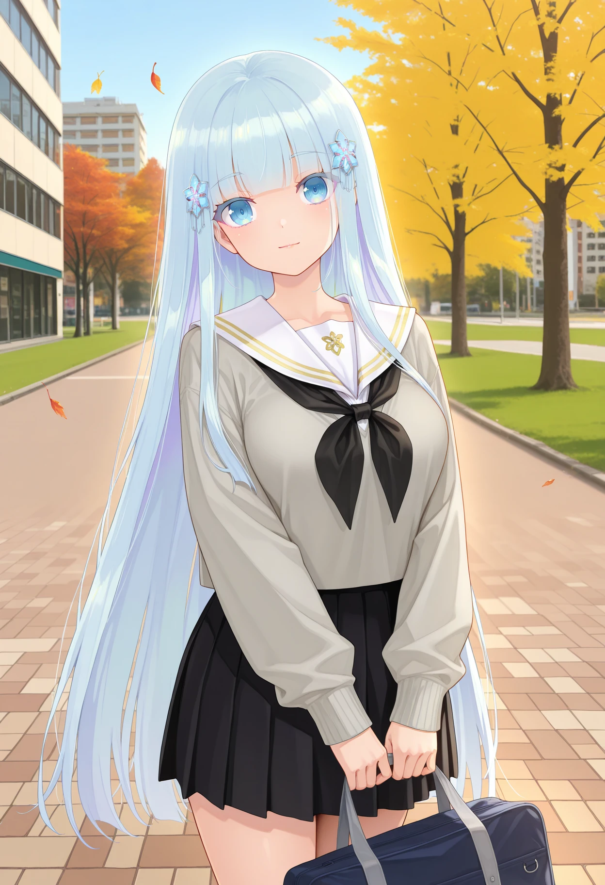 white sailor collar, grey sweater, black neckerchief, pleated skirt, black skirt