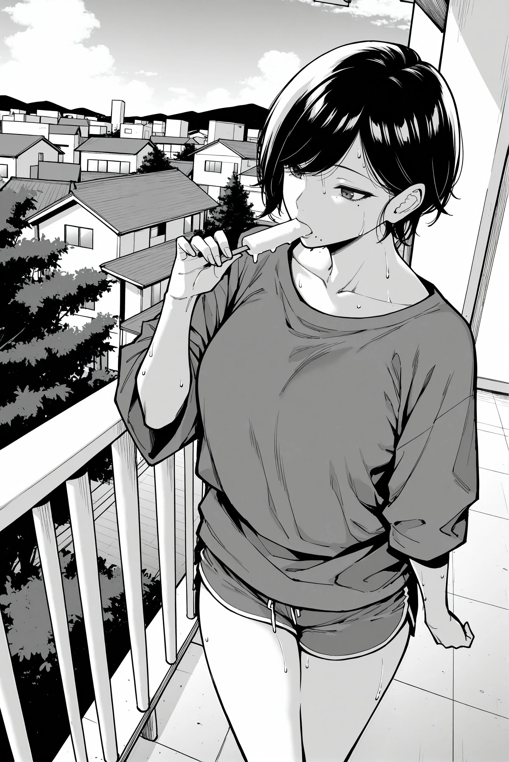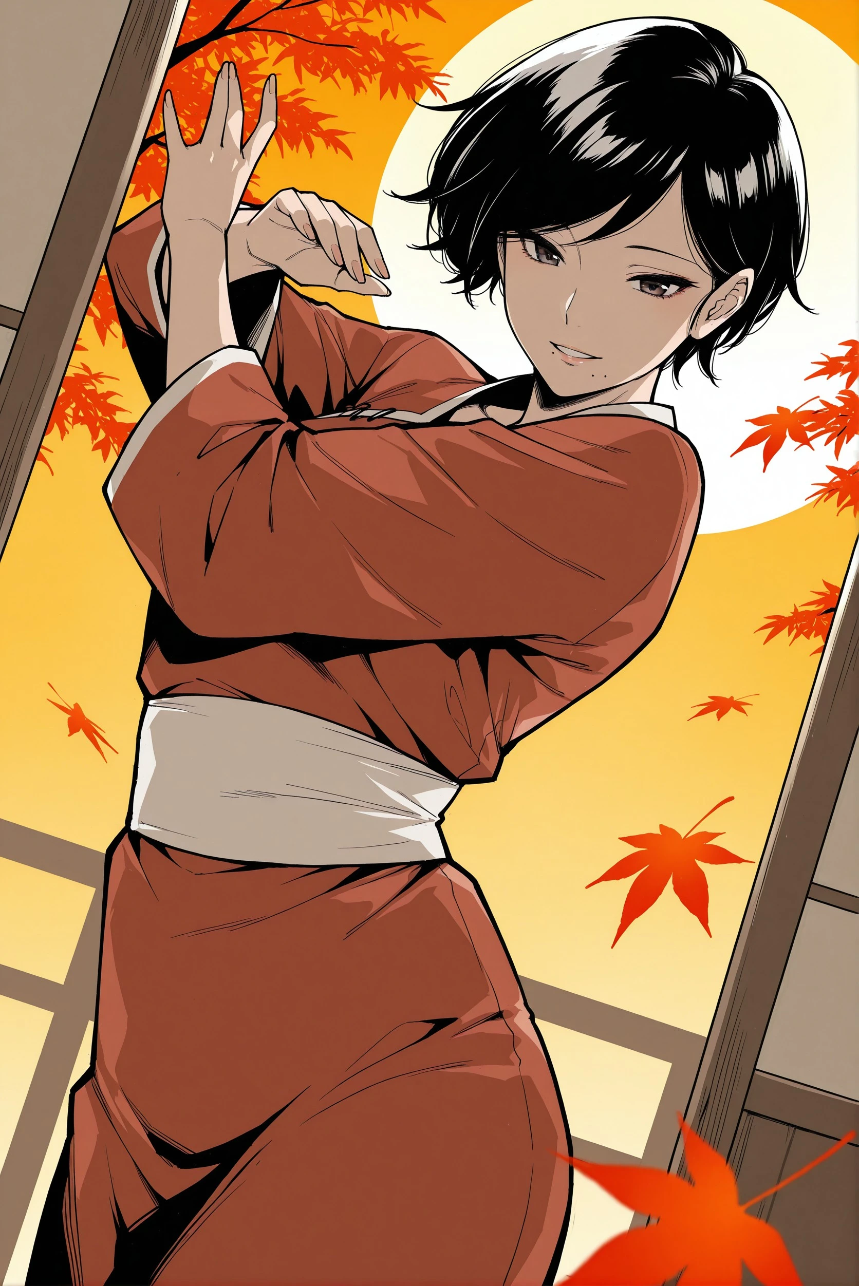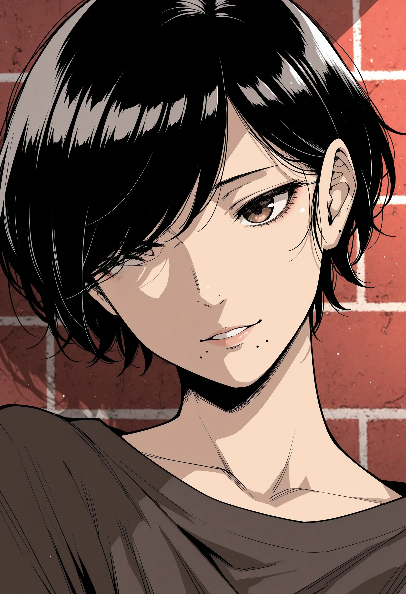 sh1n0, short hair, black hair, swept bangs, mole under mouth