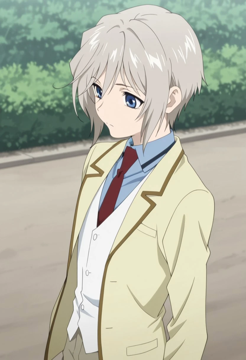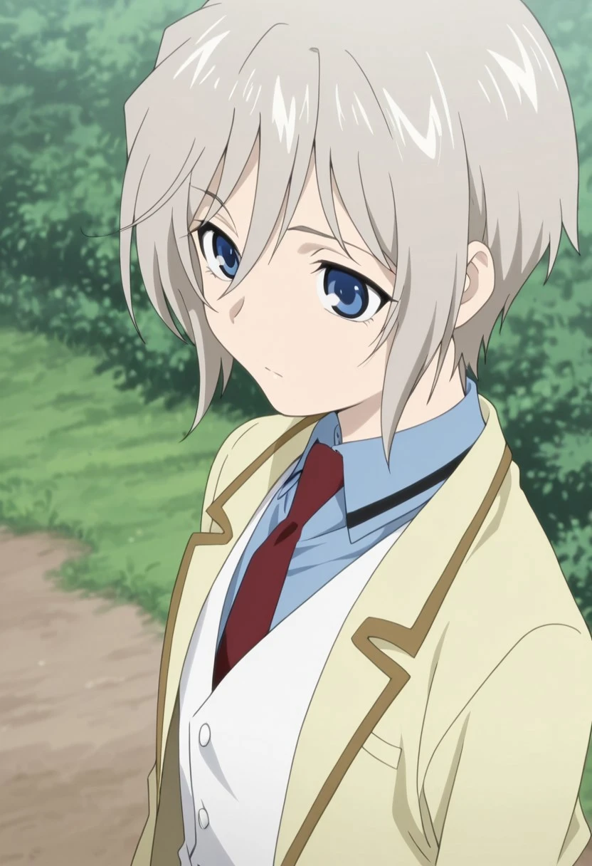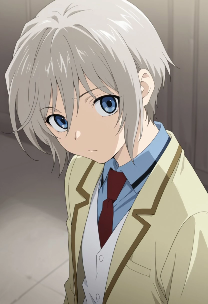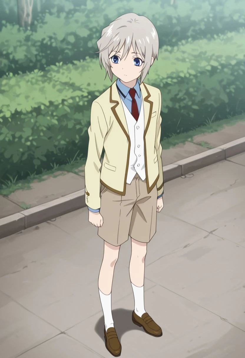 1boy, male focus, solo, blue eyes, grey hair, blue shirt, collared shirt, red necktie, sweater vest, white vest, short sleeves, brown shorts,