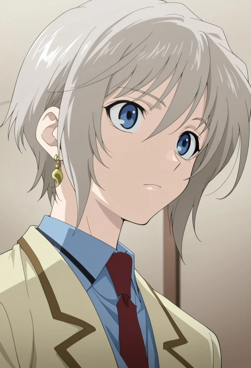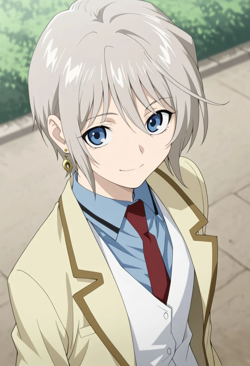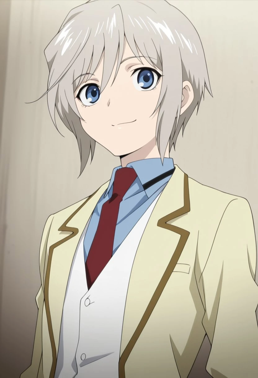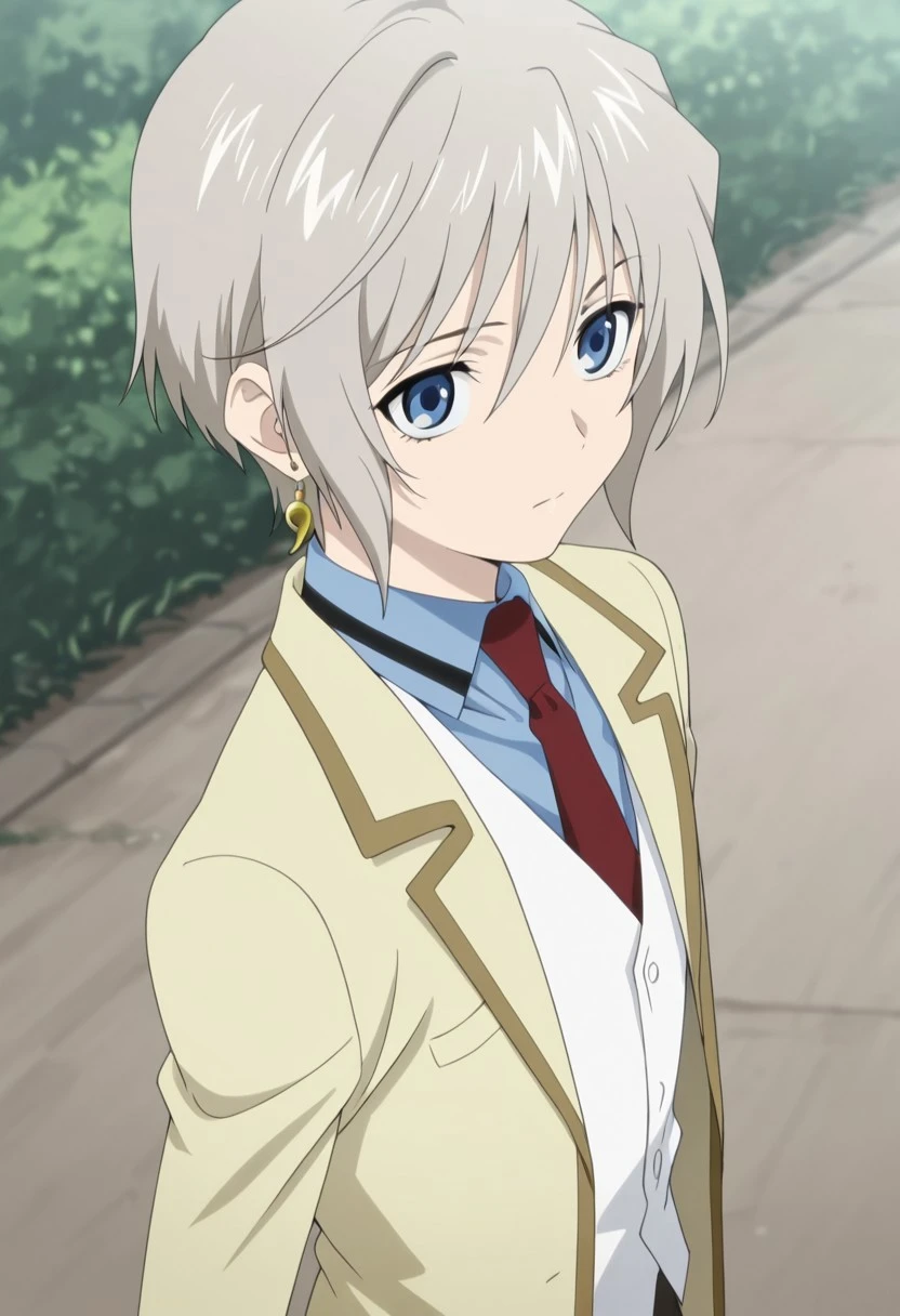 1boy, male focus, solo, blue eyes, grey hair, blue shirt, collared shirt, red necktie, sweater vest, white vest, short sleeves, brown shorts,