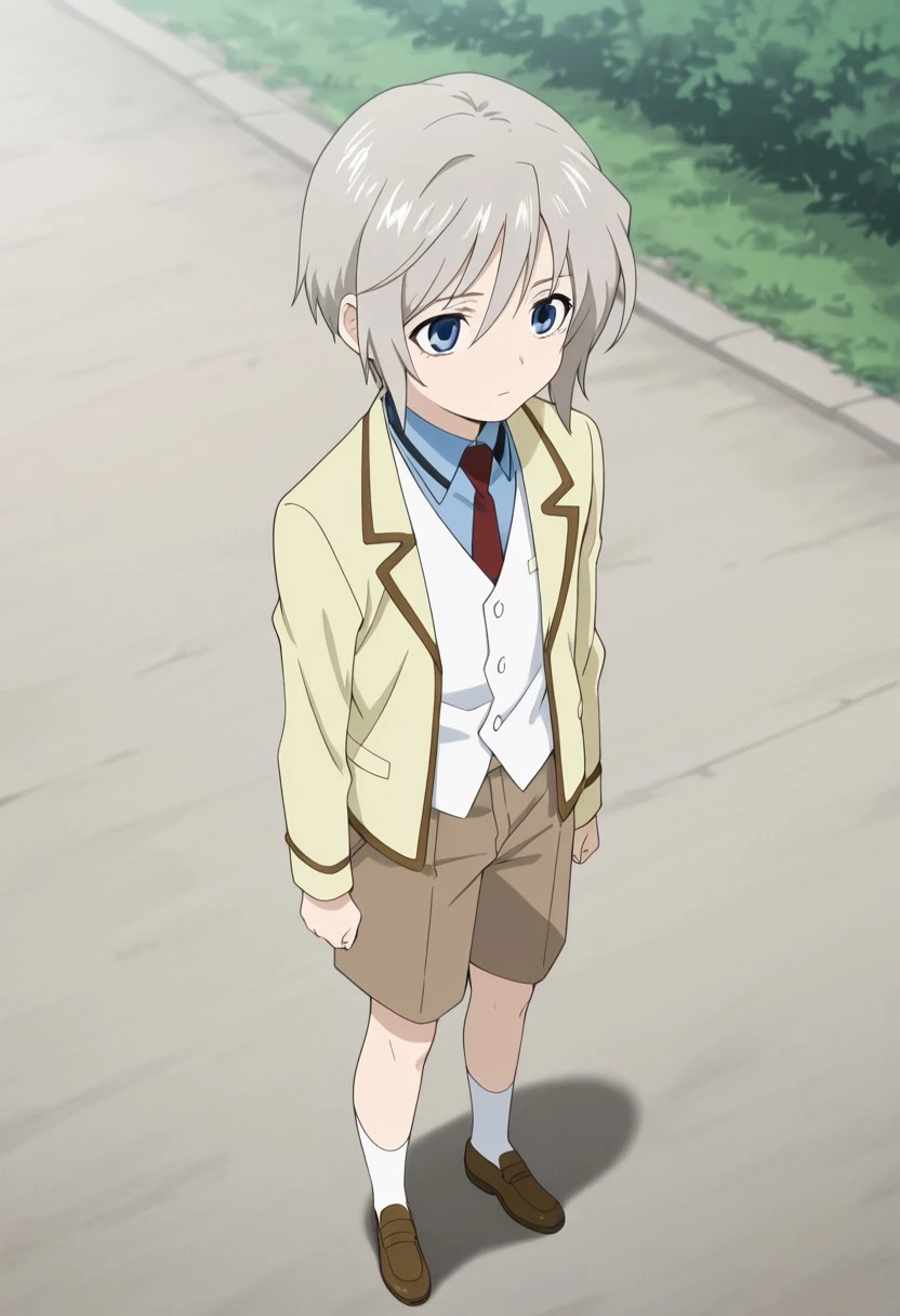 1boy, male focus, solo, blue eyes, grey hair, blue shirt, collared shirt, red necktie, brown jacket, long sleeves, open jacket, white vest, brown shorts, white socks, shoes, brown footwear,