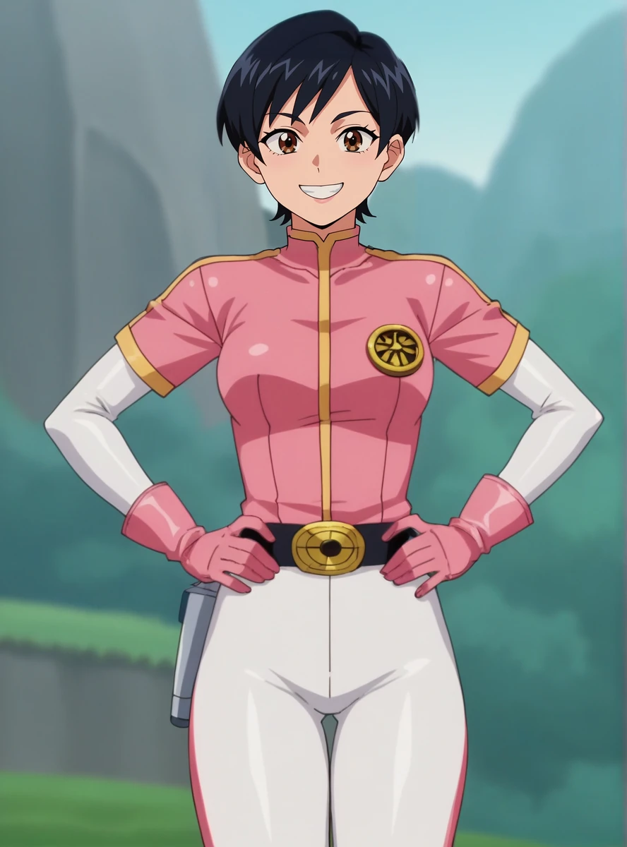 prompts : helmet, 1girl, solo, gloves, belt, pink gloves, bodysuit white_pants