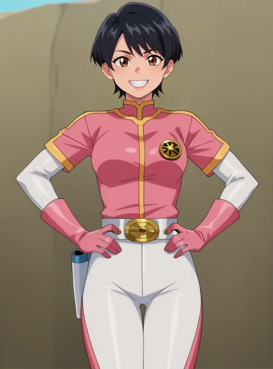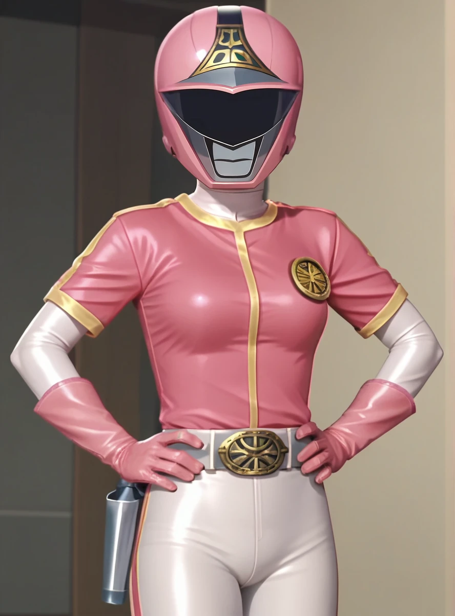 helmet, 1girl, solo, gloves, belt, pink gloves, bodysuit white_pants