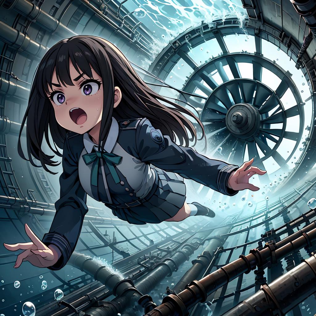 A 2D Japanese anime-style illustration of a girl with school uniform is swimming the crawl stroke for escaping from a large sucking turbine in a water-filled industrial pipe, viewed from a diagonal front angle. a large turbine is sucking water, air bubbles and rubbles. The scene captures the dynamic movement of her arms and legs as she swims through the clear blue water. Bubbles and ripples in the water emphasize the motion and energy of the swimming action. She's swimming with all her might, her face showing fear and determination. The water waves flows towards the turbine, creating a dynamic and perilous environment. The dim lighting in the pipe enhances the intensity and danger of the scene.