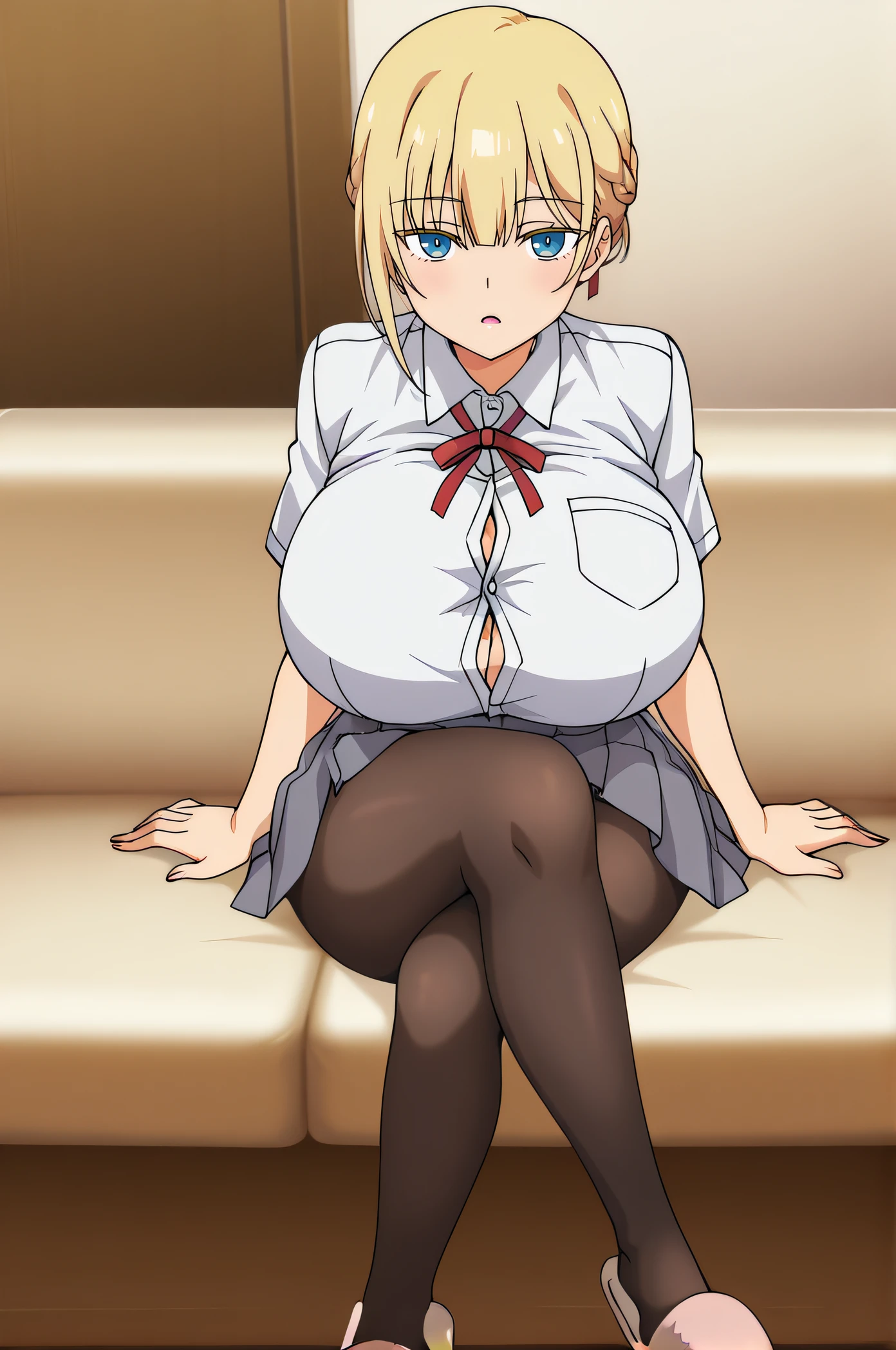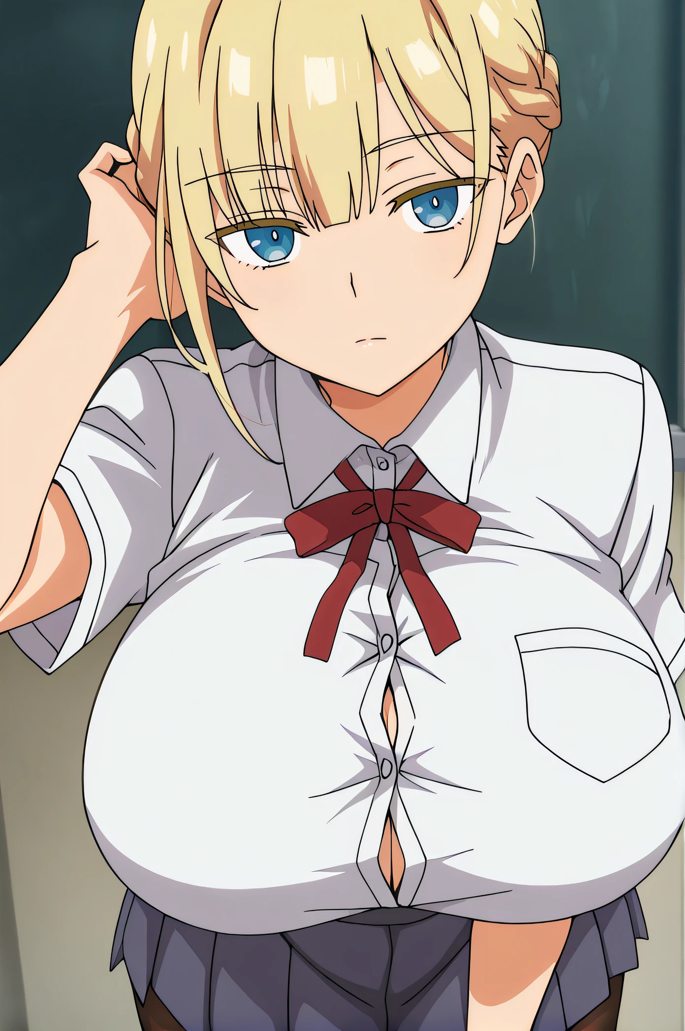 alice, blonde hair, blue eyes, french braid, short hair, huge breasts, school uniform, white shirt, red ribbon, bursting breasts, button gap, pleated skirt, black pantyhose