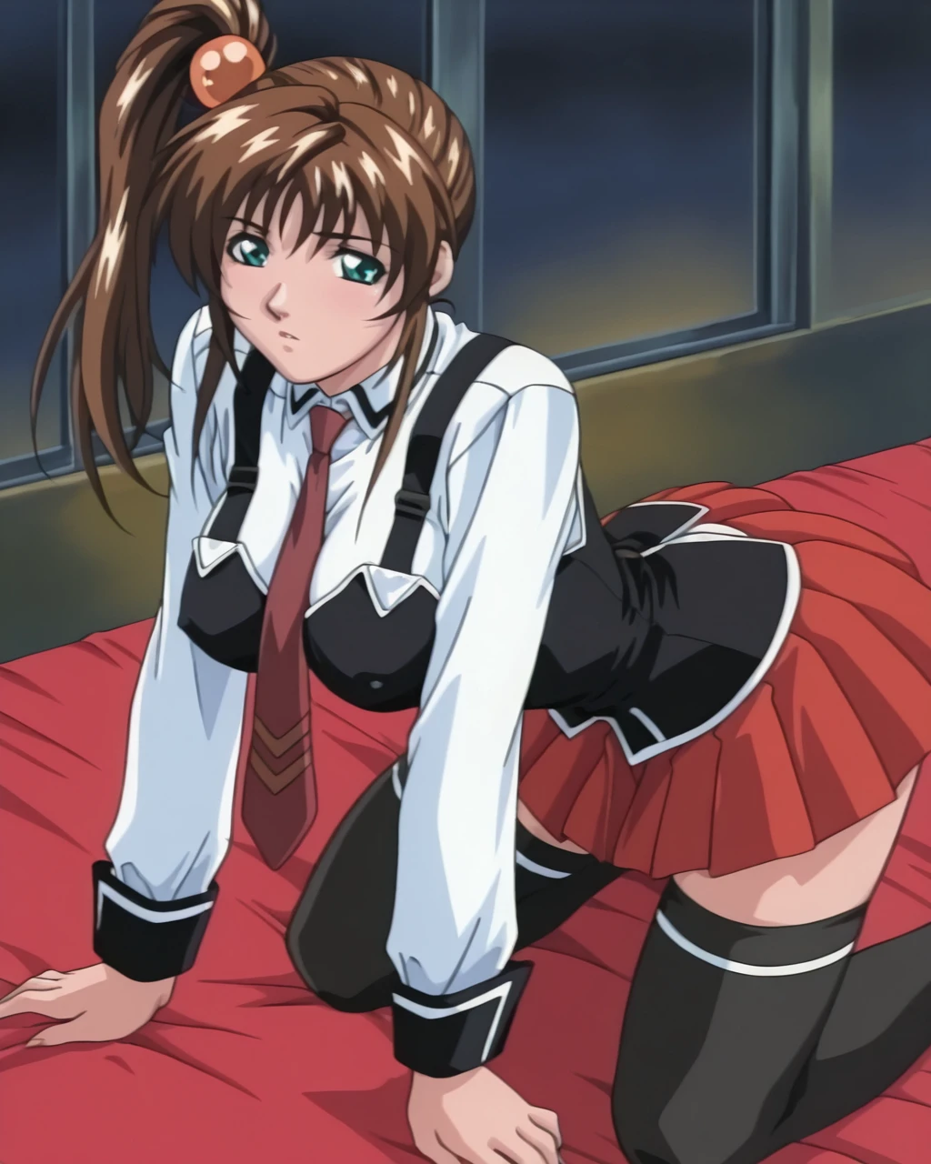 kurumi imari, kurumi, brown hair, long hair, side ponytail, hair ornament, hair bobbles, hair ornament, teal eyes, large breast, 1990s (style), retro artstyle, 1girl, solo