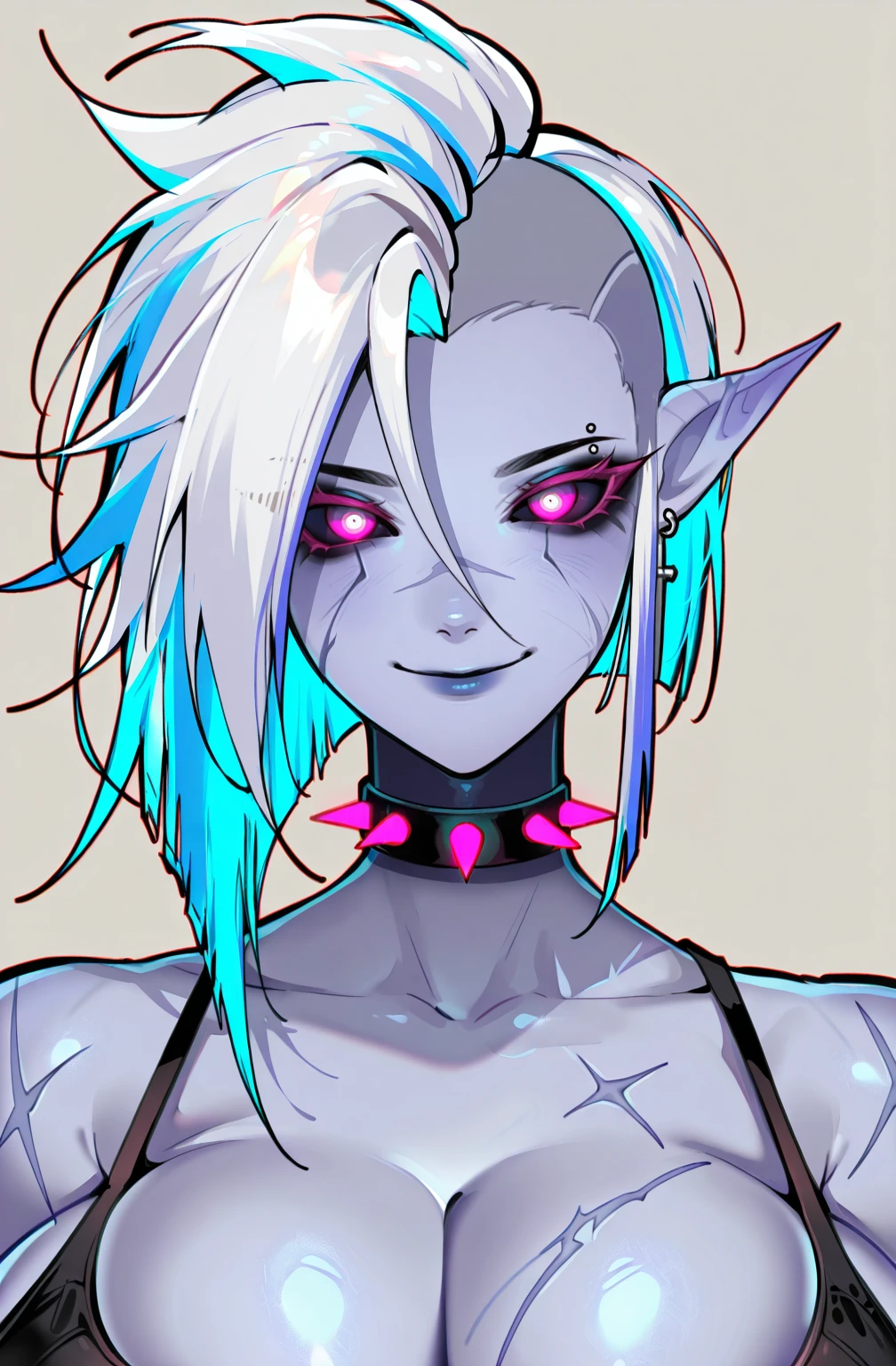 bladechan, pointy ears, black sclera, colored skin, white hair, spiked collar, earrings, scar, pink eyes, scar on face, piercing