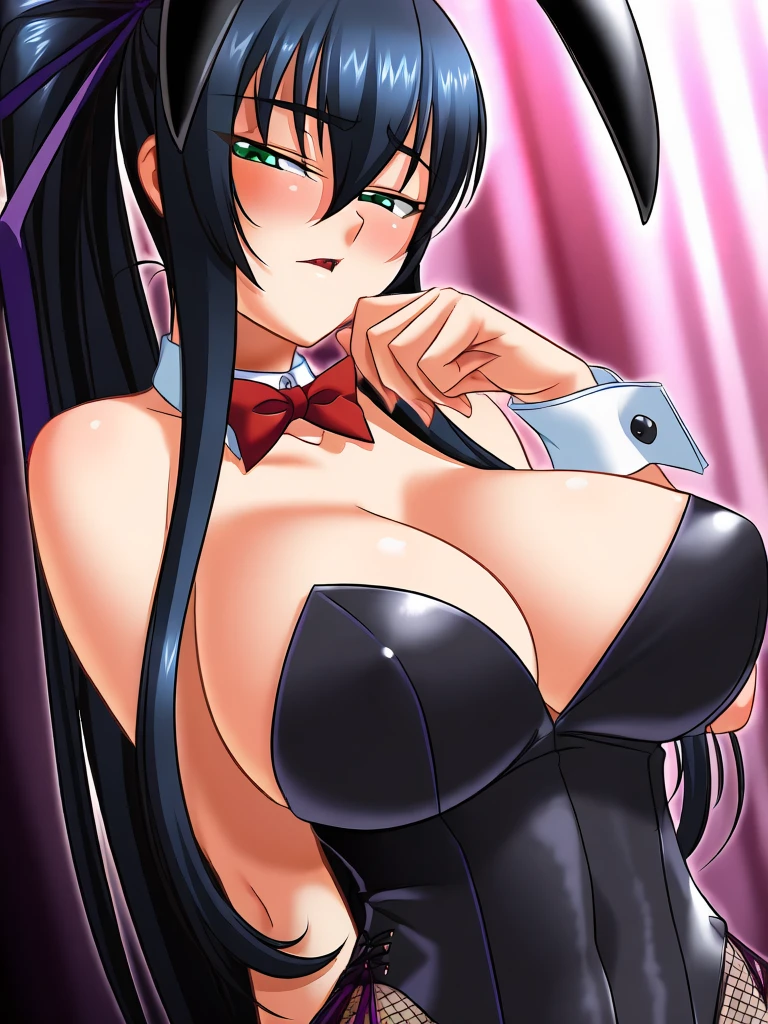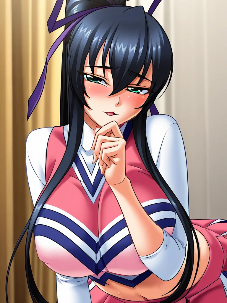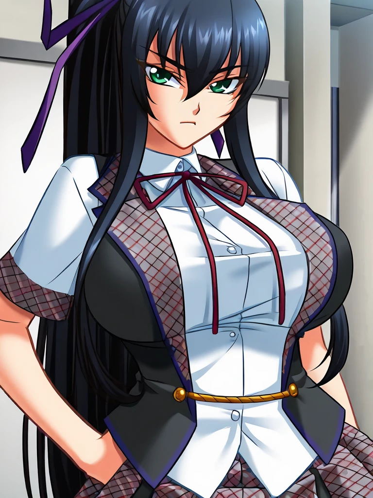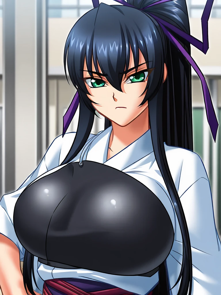 Core Tags : Lo_uratsubaki, black hair, long hair, high ponytail, hip-length hair, long side locks, purple ribbon, hair ribbon, long dangling ribbon, green eyes, large breasts